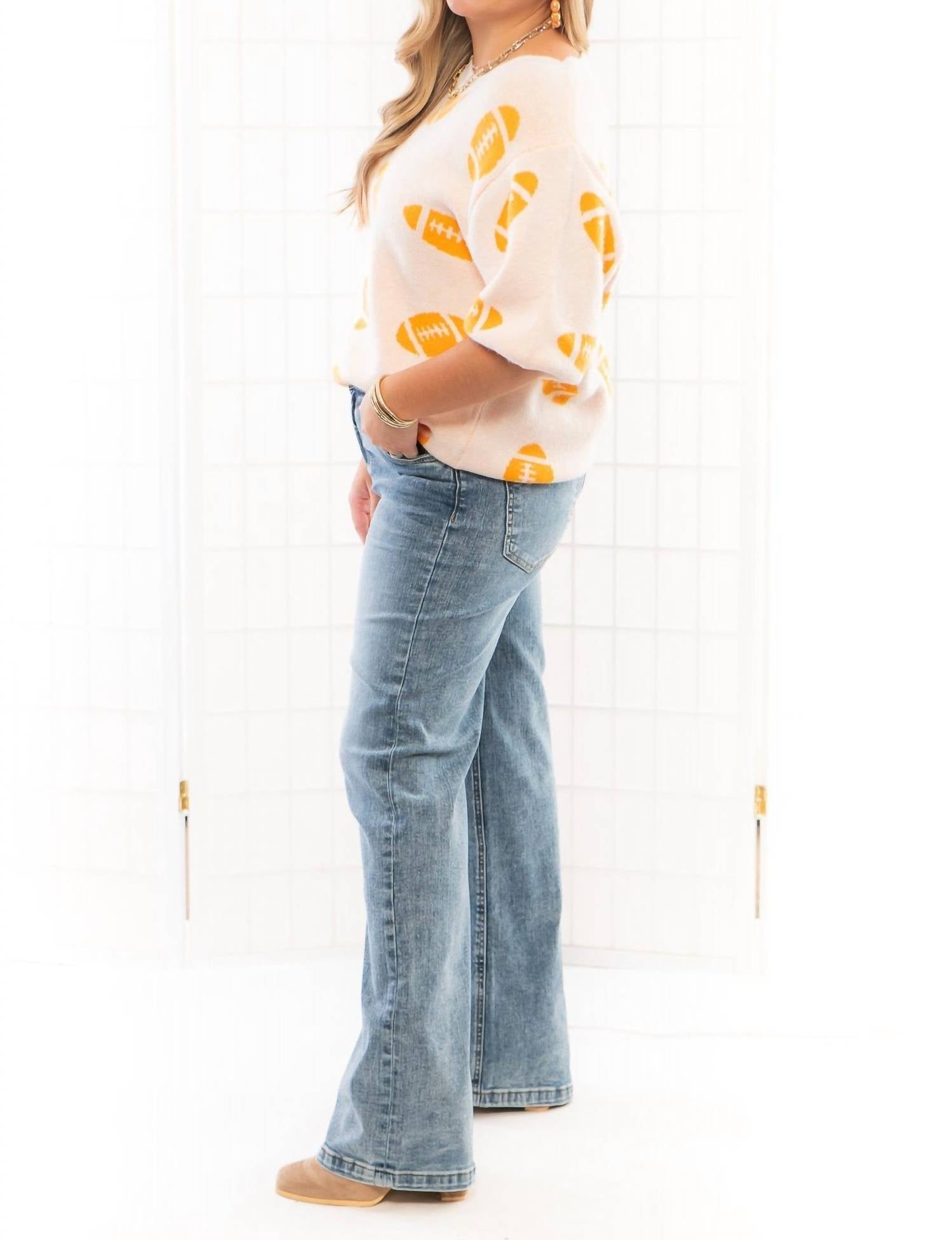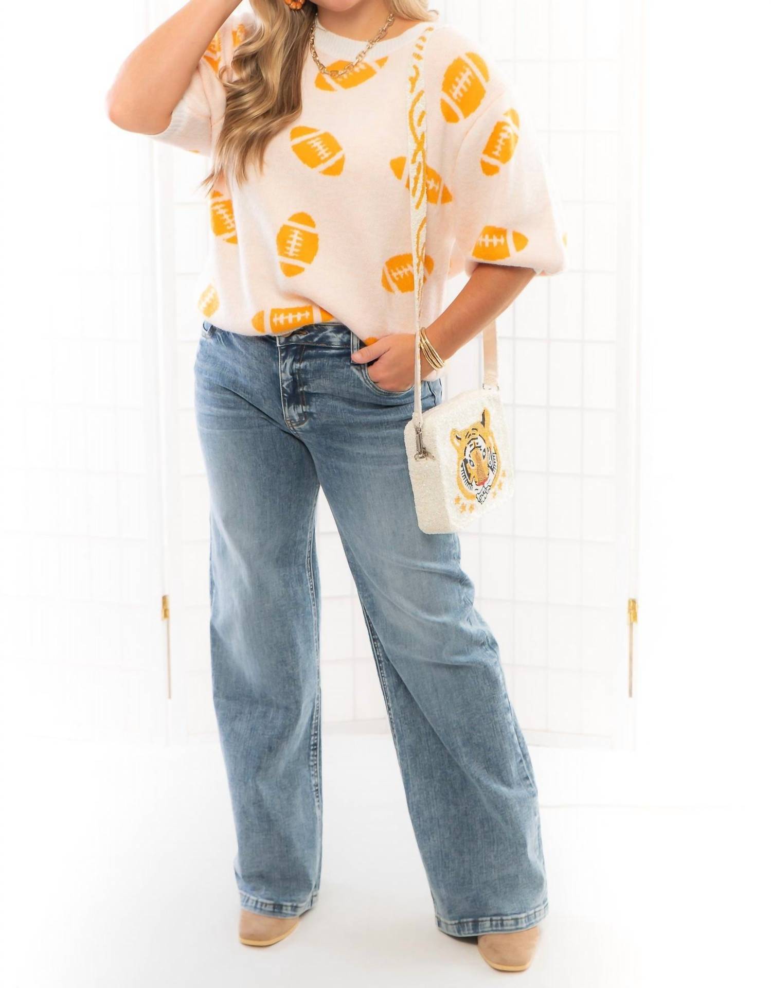 Experience the perfect blend of comfort and style with this trendy crew neck sweater, designed to effortlessly elevate your wardrobe. Pair it with your favorite denim and loafers for the perfect look. Made from comfortable cotton, this sweater features a playful graphic design and a classic crewneck, ideal for staying effortlessly stylish. Its short sleeves ensure comfort, while the pull-on closure adds convenience to your game day preparations. Stand out in the stands or at a watch party with this chic football-inspired piece.