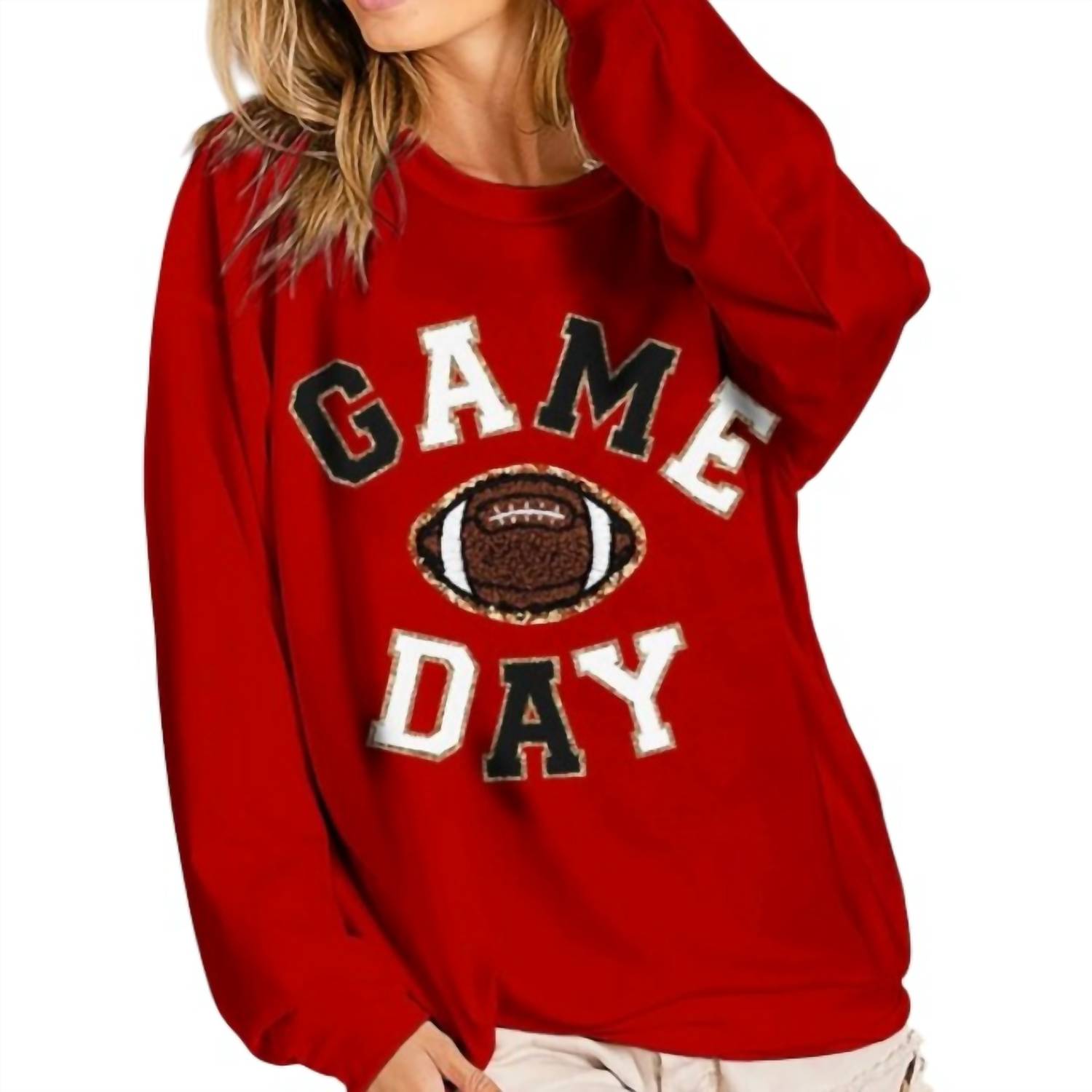 Introducing the Game Day Letter Patches Sweatshirt by BiBi, designed for women looking to showcase their team spirit in style. This red, long sleeve sweatshirt features a textured pattern with a minimalist trend, making it the perfect choice for game day occasions in spring. Crafted with a comfortable fit, it offers a crewneck design and a convenient pull-on closure, allowing for easy wear.
