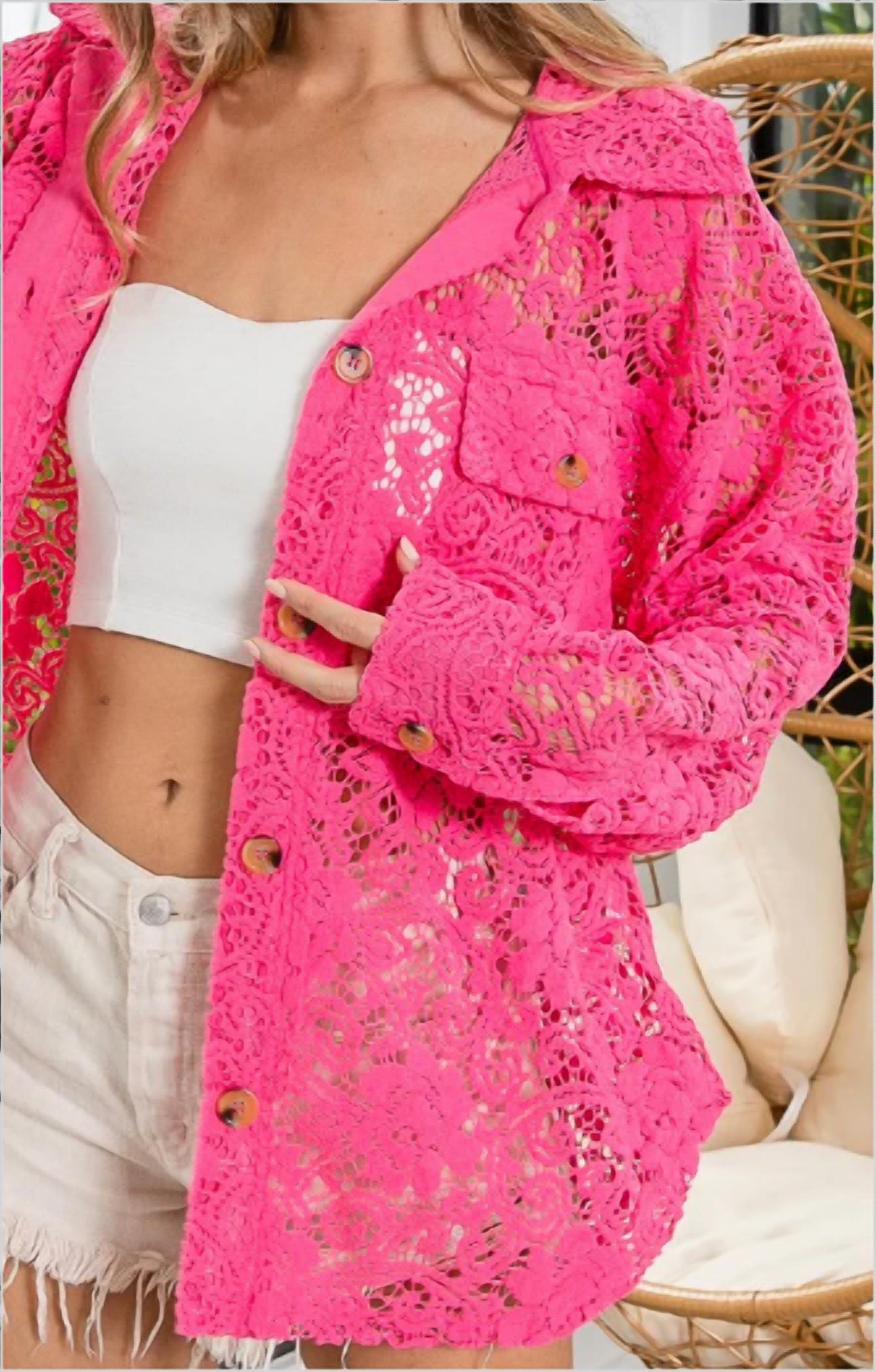 Embrace bold style with the BiBi Oversized Lace Shacket in vibrant fuchsia. This women’s patterned shacket features a classic collar and long sleeves, crafted from 100% polyester for a comfortable fit. Closure: Button closure. Pockets: Yes, for added convenience. Please follow included care instructions for maintenance.