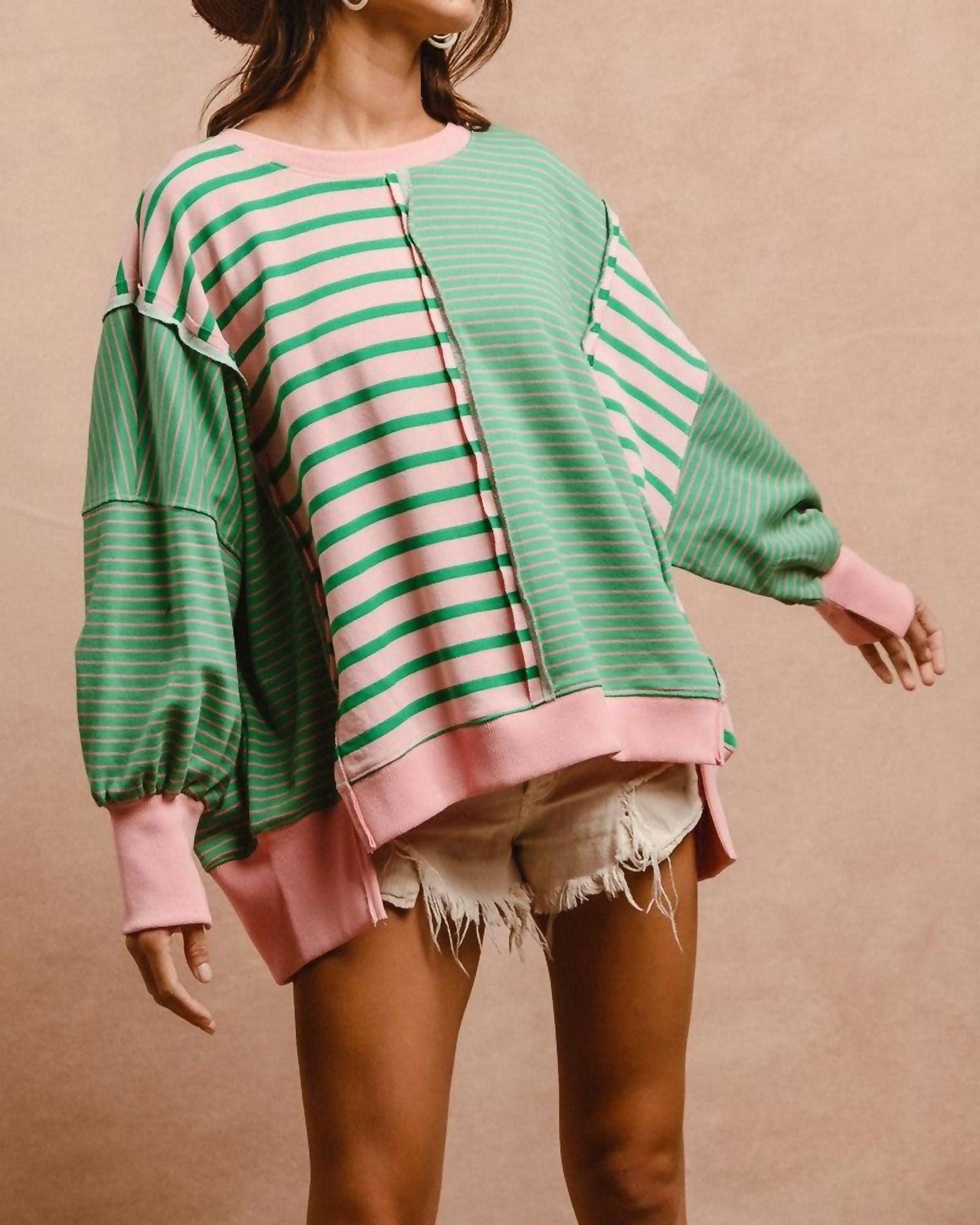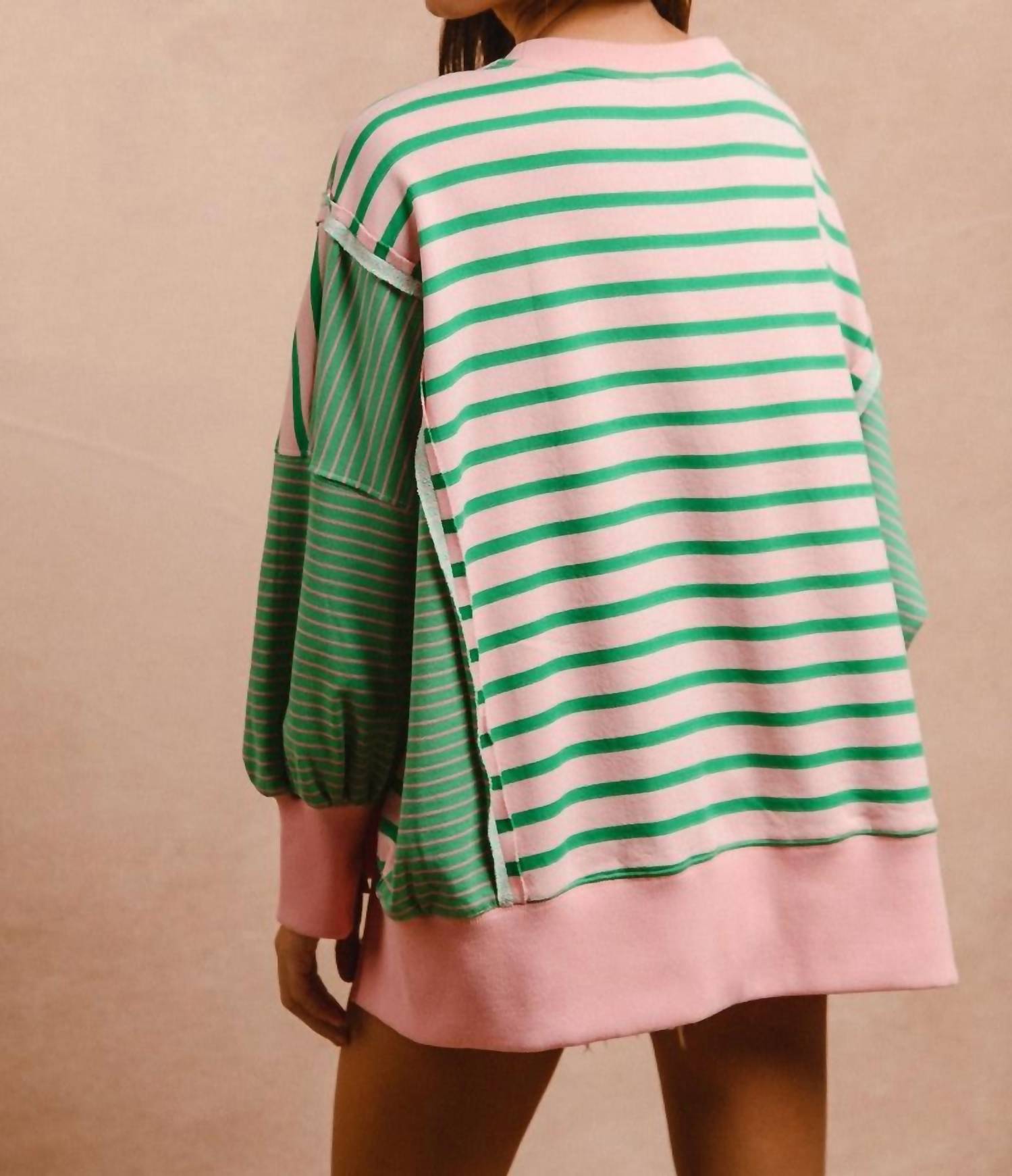 Experience the perfect blend of comfort and style with this trendy crew neck sweater, designed to effortlessly elevate your wardrobe. Pair it with your favorite denim and loafers for the perfect look. Elevate your casual wardrobe with the Varsity Stripe Mix and Match Top by BiBi in a playful blush and emerald stripe pattern. This women's long-sleeve, oversized top is crafted from a unique blend: 70% Polyester, 30% Cotton with contrasting materials, offering both comfort and style. Featuring drop shoulders and banded cuffs with slits, it boasts a chic hi-low banded hem and outseam raw cut details. Closure is pull on for ease, with care instructions recommending a hand wash and line dry to maintain its vibrant look.
