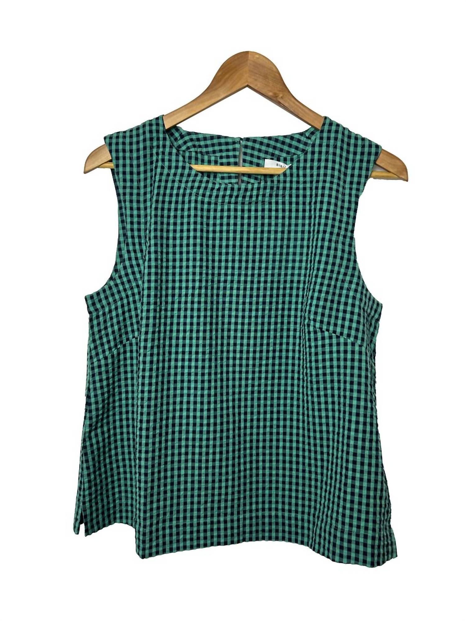 Presenting the Pippa Sleeveless Top Gingham by BIBICO, a chic summer essential crafted from 100% cotton seersucker. This olive and white check top boasts a soft A-line shape and a square cut, ideal for a relaxed fit. Ethically made in India, it features an open neckline with a charming back button closure. Perfect for vacation wear, it pairs effortlessly with the matching Jolene Skirt or your favorite trousers and skirts.
