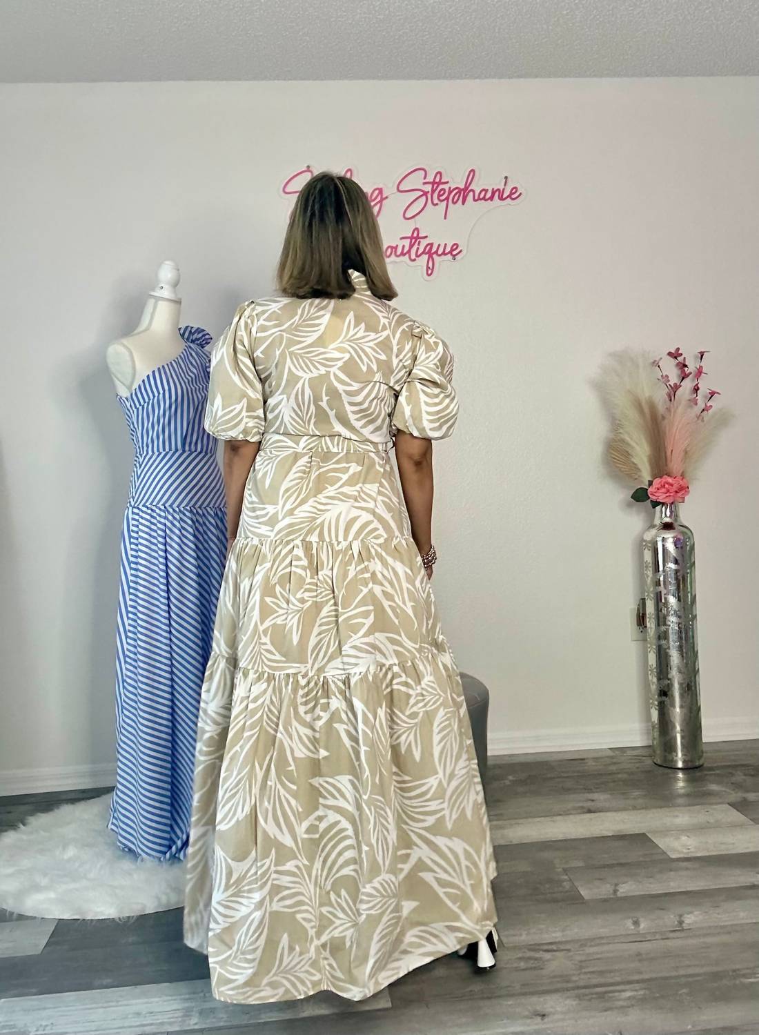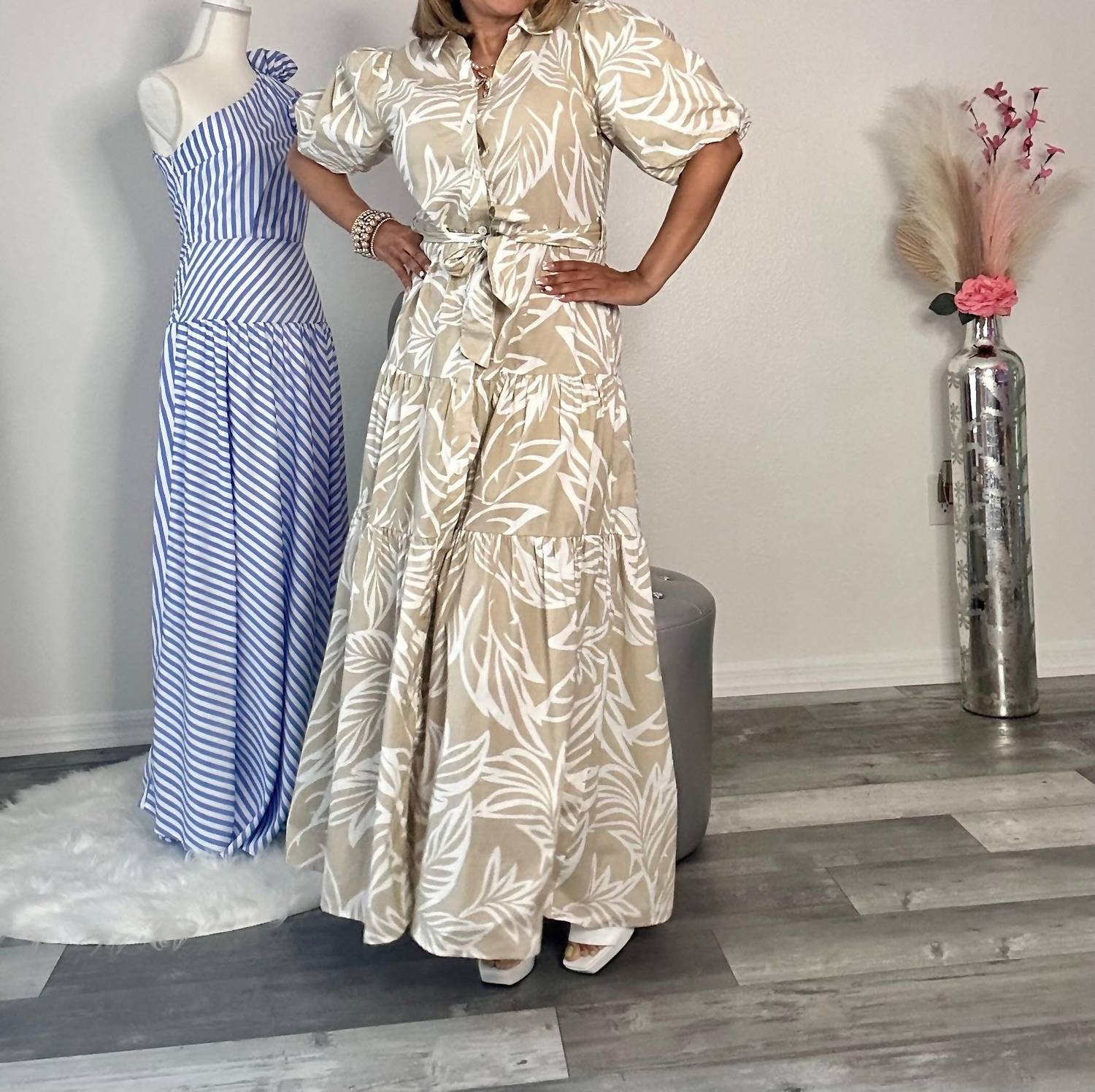 Discover the Woven Palm Print Bubble Sleeve Maxi Dress by BIG HIT FASHION, a taupe-hued masterpiece perfect for your next vacation. This women’s dress features short sleeves and a flattering V-neckline, all in a lightweight A-line silhouette. Crafted from 100% cotton, it offers breathable comfort with a chic patterned design. Closure is secured with button closure, and for care, machine wash and line dry.