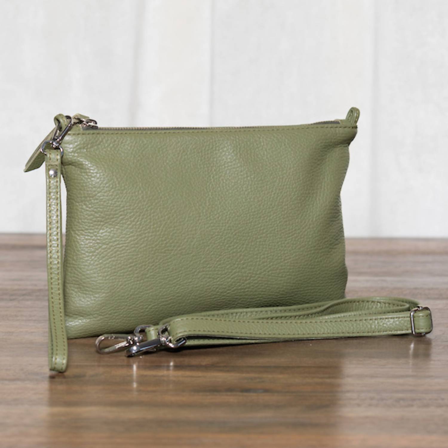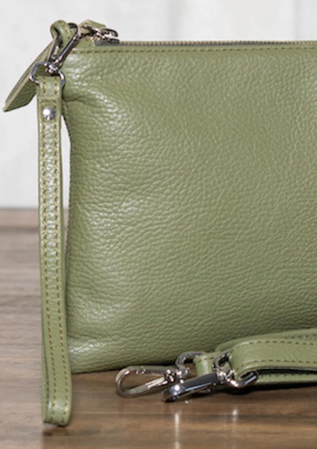 Lipstick, check. Mints, check. Credit card, check. The cutest little bag that holds all of your necessities. Presenting the Claudia Clutch Bag by BijouRocks, a chic accessory in elegant olive. Crafted in Italy from premium pebbled leather, it features a thoughtfully designed interior with 100% cotton twill lining and a secure zipper pocket. This versatile clutch comes with both a detachable leather wrist strap and an adjustable cross body strap, providing flexible carrying options. It includes a 100% cotton dust bag for safekeeping.