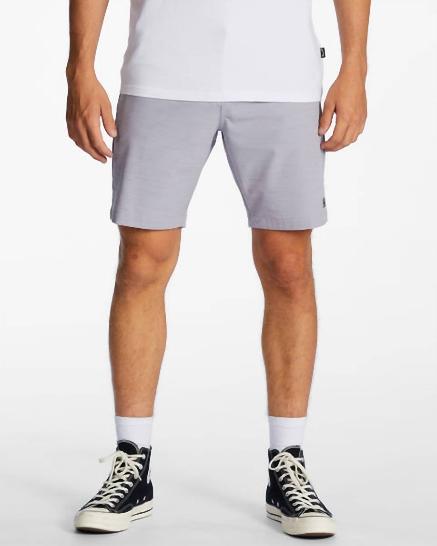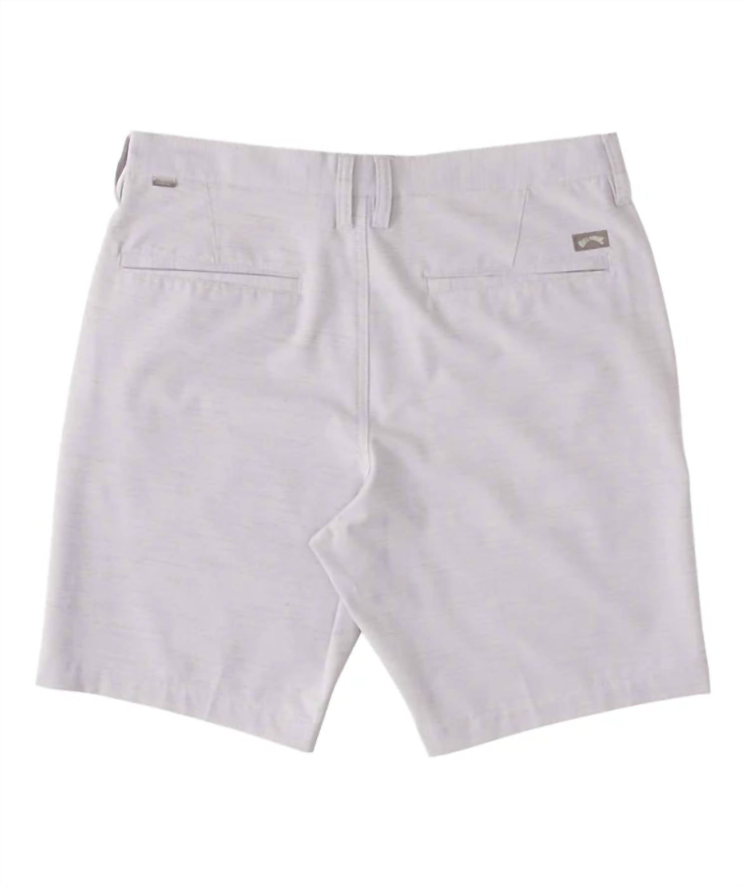 Introducing the Crossfire Short by Billabong, a versatile hybrid ideal for both surf and casual settings. Crafted from a 4-way stretch recycled polyester, cotton, and elastane blend, these eco-conscious shorts offer a quick-dry slub texture with a core fit and a long 21" outseam. The grey shorts feature slant front pockets, a zipped back pocket, and chino styling for a classic look, finished with a button closure. Made with recycled PET plastic bottles, they demonstrate a commitment to sustainability without compromising on style or functionality.