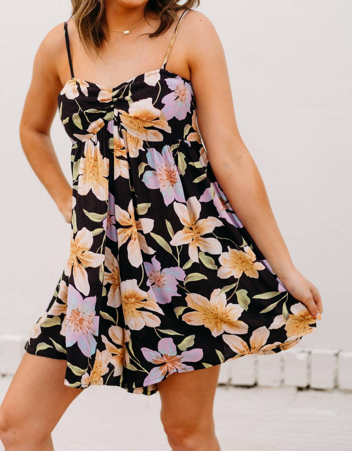 Throw it on and go! Step into summer with the Star Glow Romper by Billabong, an ideal choice for vacation-ready style. Crafted from lightweight 100% viscose with a charming crinkle texture, this romper features a flattering fitted V-neck bodice that transitions into easy, relaxed shorts with an inseam of 4 1/4". Its floral pattern in Black Multi complements the metal plate detail for added flair. With no pockets to weigh you down, it's perfect for those scorching summer days.