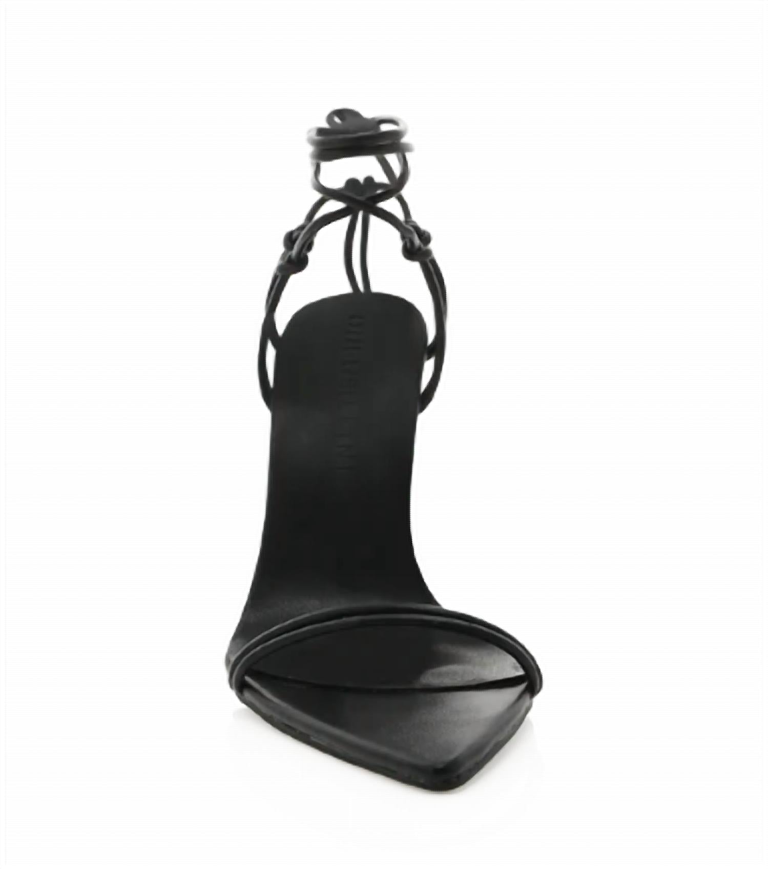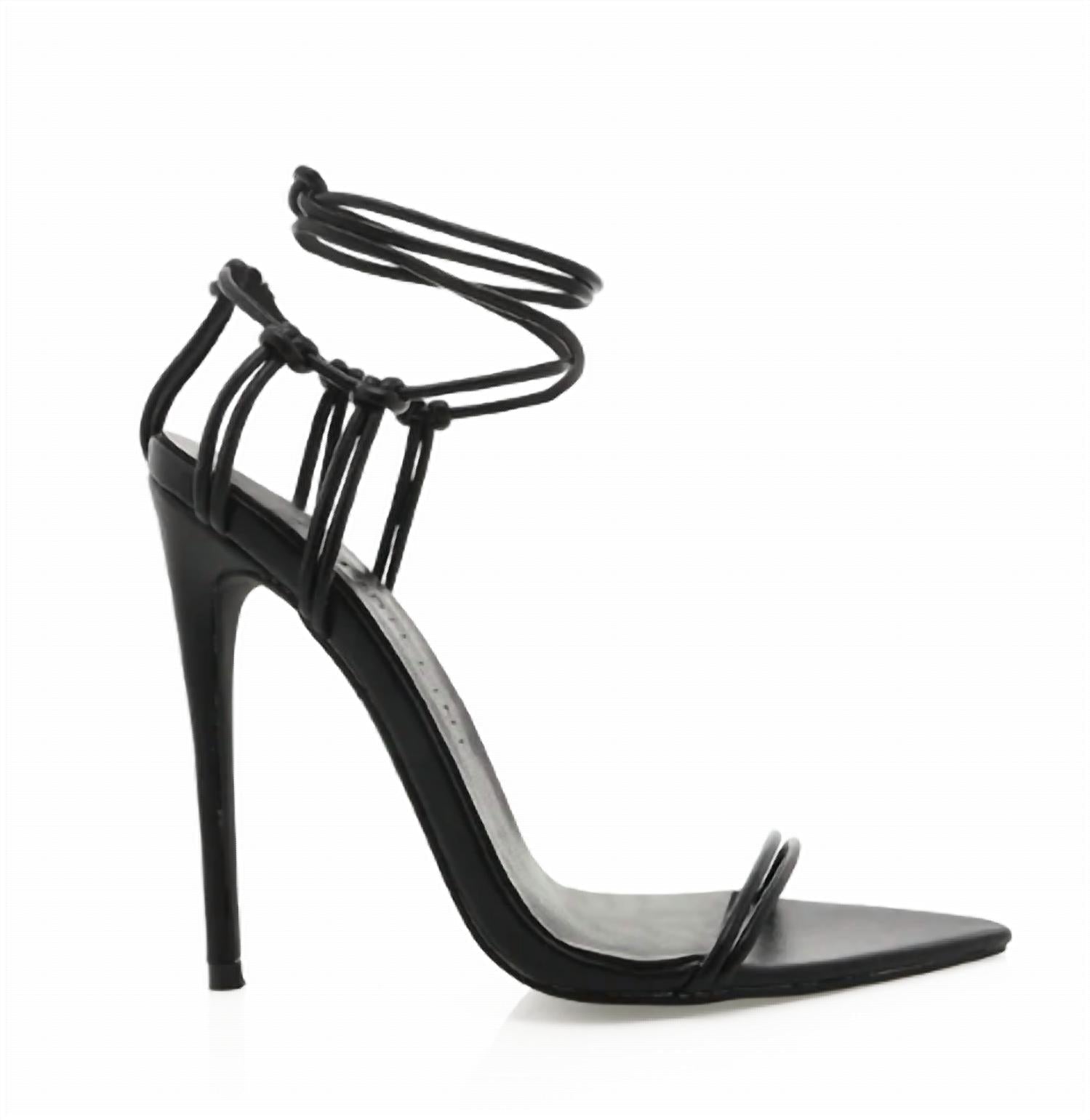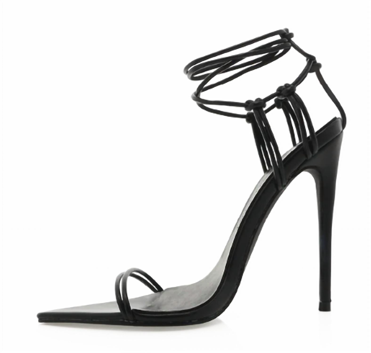 The perfect height for day to night. Step into sophistication with the Gisele Lace Up Heel by BiLLiNi, a standout in sleek black designed for the modern woman. This high stiletto heel, standing at 4.75 inches, showcases a sharp pointed open toe with tubular double straps. The eye-catching knotted caged heel counter is complemented by lace-up ankle strap ties, making it a perfect addition for a cocktail party. Crafted from synthetic material, these heels are your go-to for making a bold statement.