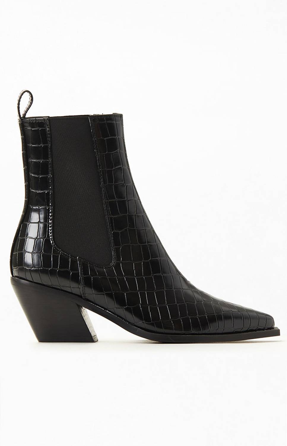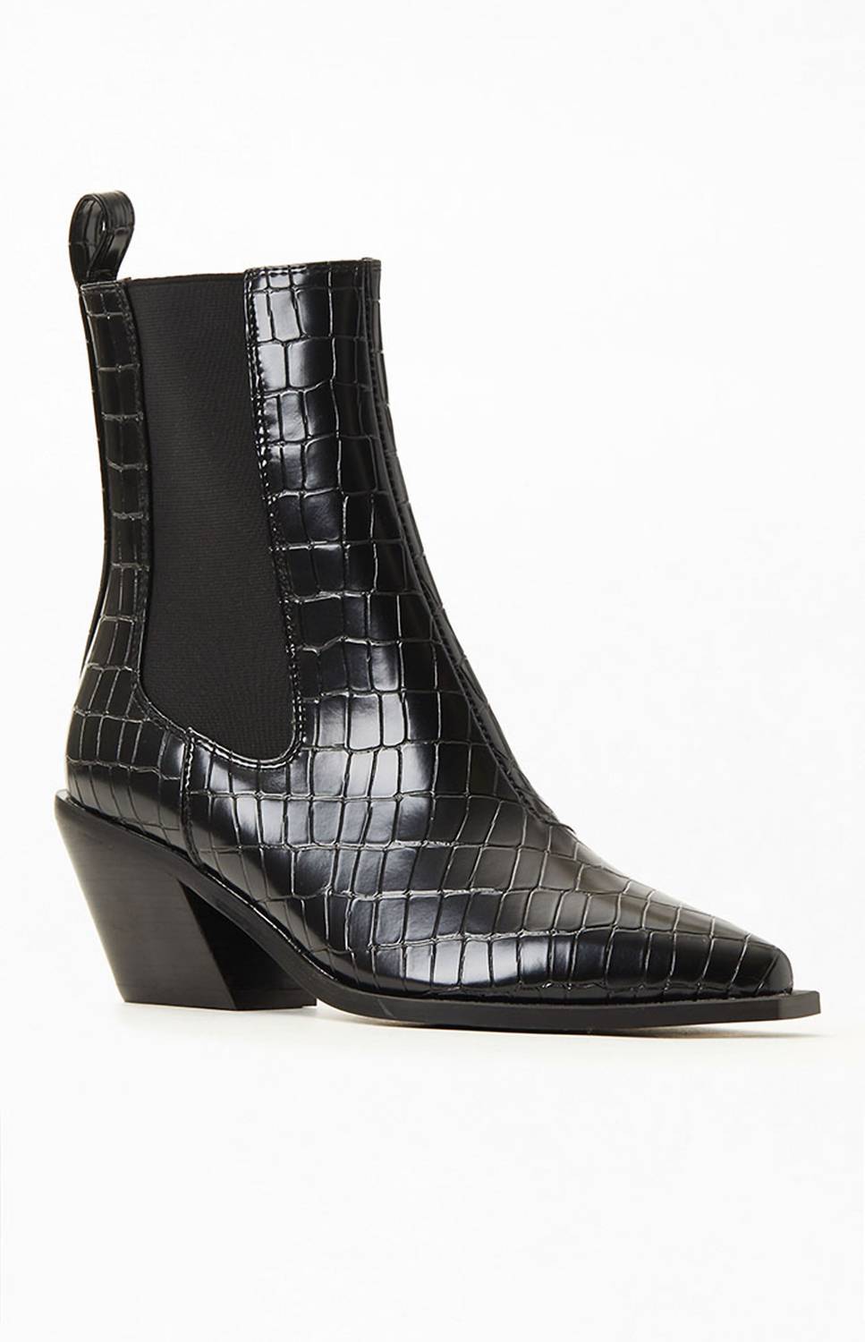 Upgrade your shoe game with these classic heeled boots, designed to merge sophistication and style. Comfortable enough for long days or a night out on the town. Step out in style with the Women's Ukaya Boots by BiLLiNi, crafted in a striking Black Croc design. These pointed-toe Chelsea boots feature a croc-embossed synthetic upper and dual inset elastic gores, complete with a sophisticated 2.75" stacked block heel. Made for women, this mid-heel boot combines fashion and comfort effortlessly. Enjoy the synthetic lining and sole for lasting durability and chic appeal.