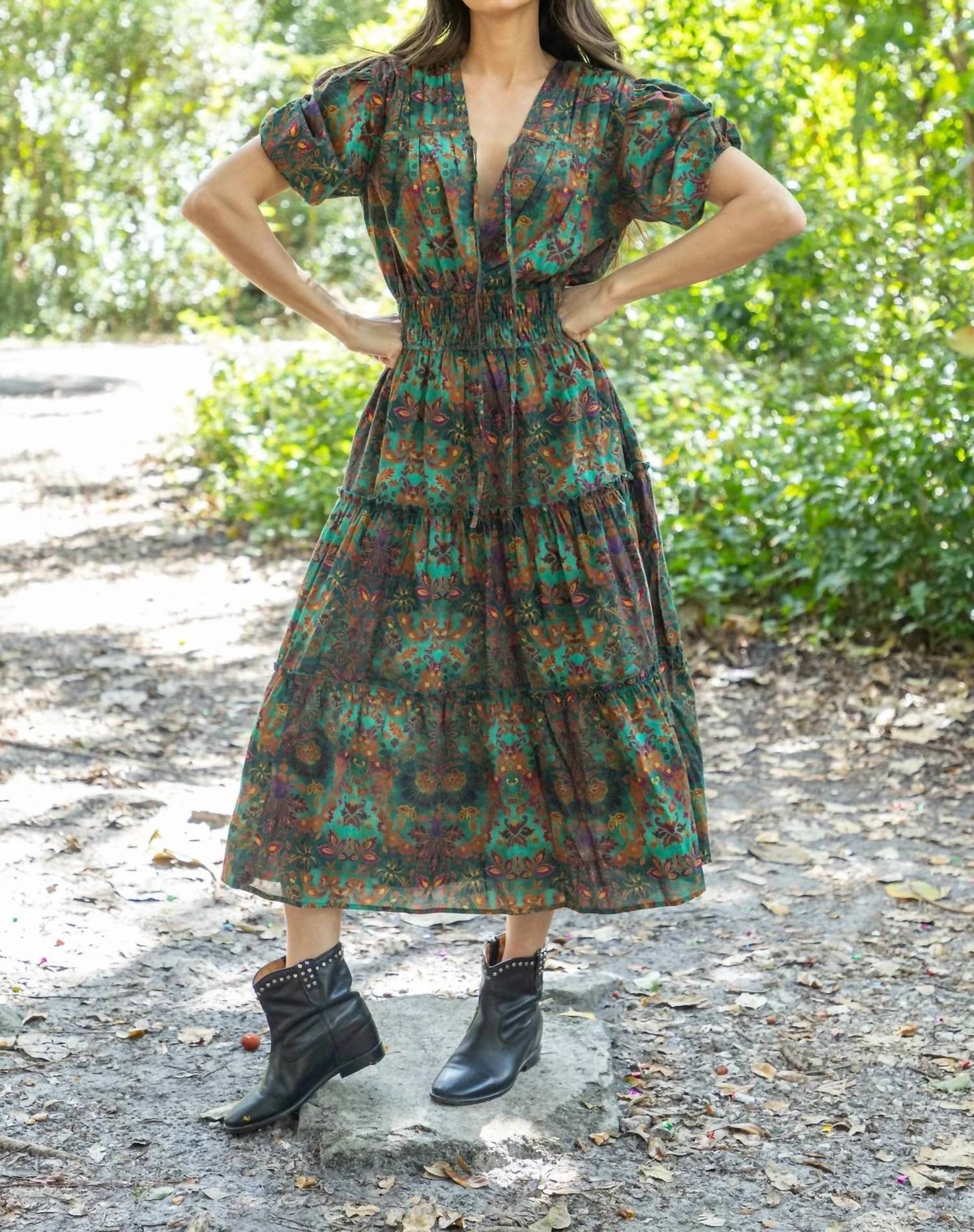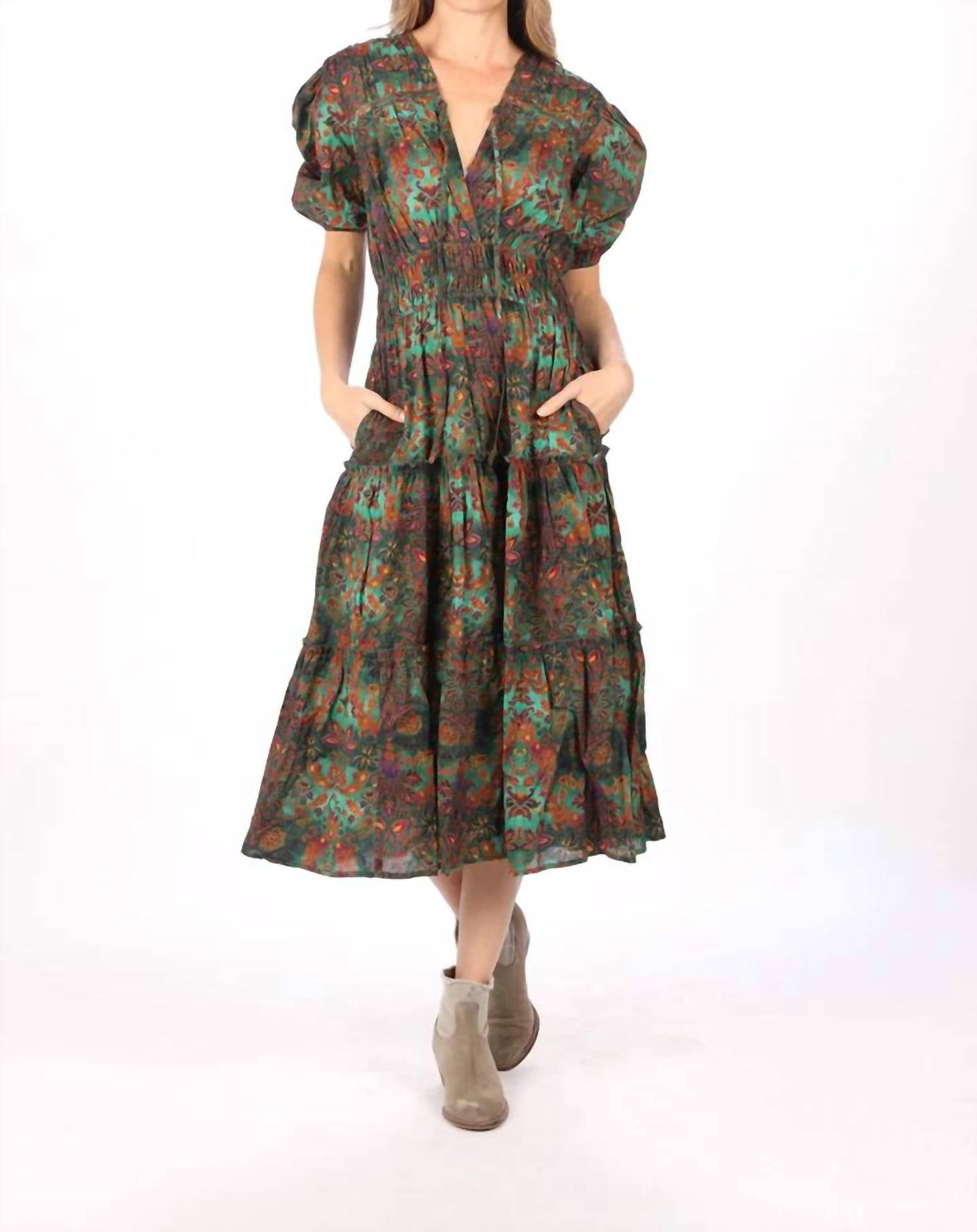 A midi dress so versatile, your options for wearing it are endless. Discover the Susana Dress by Bindu, an essential addition to your wardrobe in the stunning Dynasty color. This A-line midi dress features short semi-puff sleeves and a flattering V-neck, crafted from 100% cotton for a light, breathable fit. Enhanced with a floral pattern and convenient pull-on closure, it promises comfort with added pockets for practicality. Care: Machine wash, lay flat to dry.