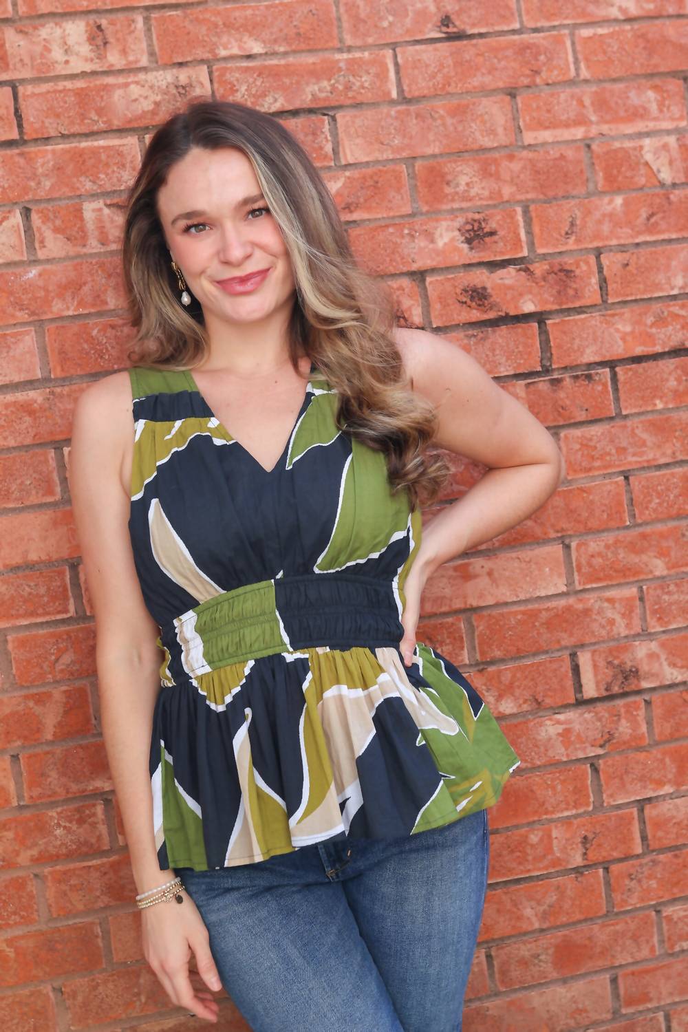 A timeless blouse that will never go out of style. Elevate your wardrobe with the Tina Top by Bindu, a perfect blend of style and comfort with its sleeveless design and striking geometric print in black and olive. The V-neck silhouette adds a touch of elegance, making it ideal for summer occasions like Thanksgiving or a baby shower. Closure: Pull on. Care instructions: Machine wash and lay flat to dry, ensuring long-lasting wear.