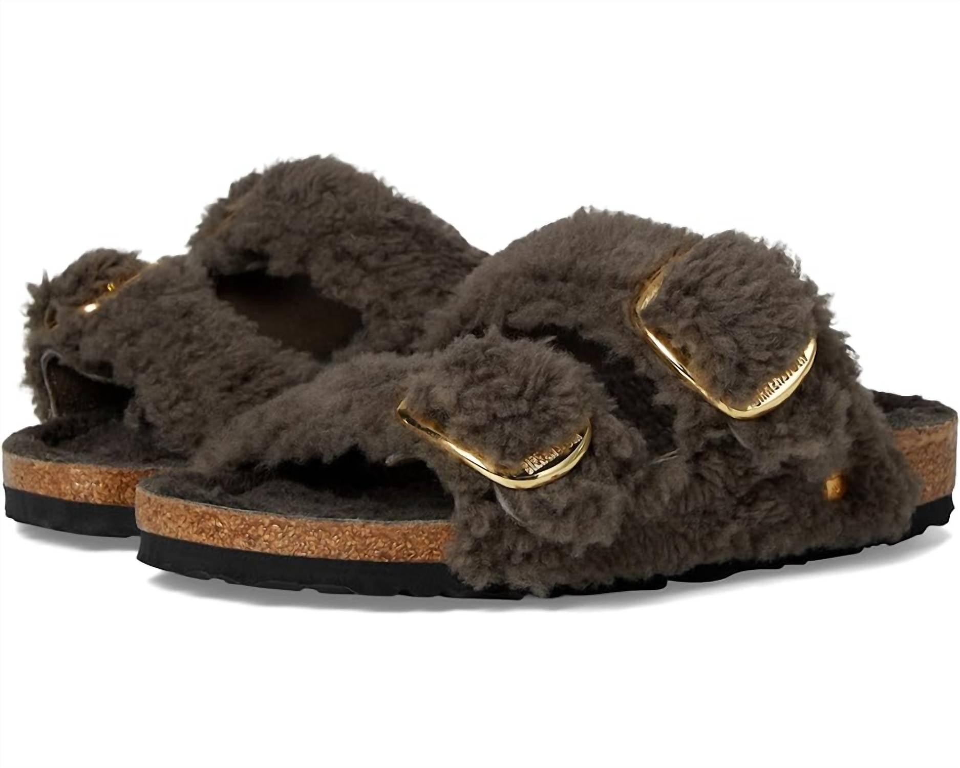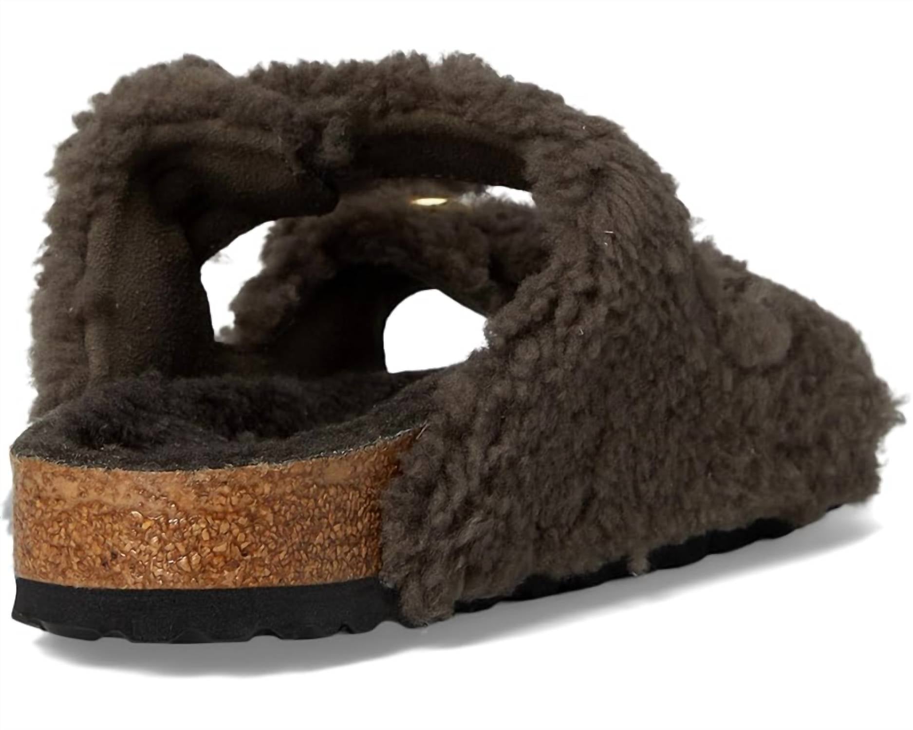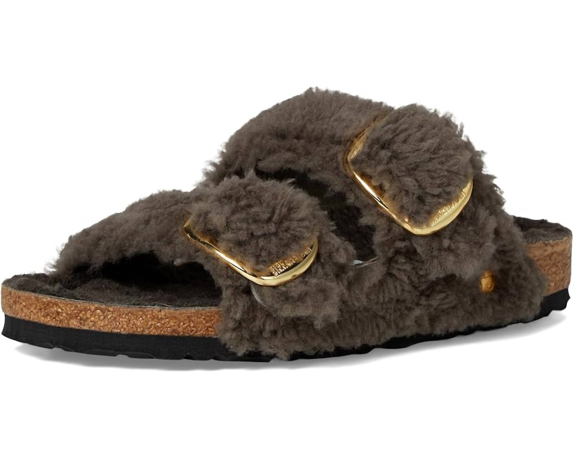 Flowy dresses, cropped pants, and even jumpsuits... this sandal works with them all! Step into plush comfort with the BIRKENSTOCK Women's Arizona Big Buckle Teddy Sandals in Concrete Gray. Crafted with an upper and lining of luxurious teddy shearling, these sandals are designed for ultimate coziness. Featuring an anatomically shaped cork-latex footbed and a 25 mm platform heel, they provide all-day arch support and comfort. The sandals are completed with dual adjustable straps, each with bold metal buckles for a secure fit, and an EVA outsole that offers added traction.