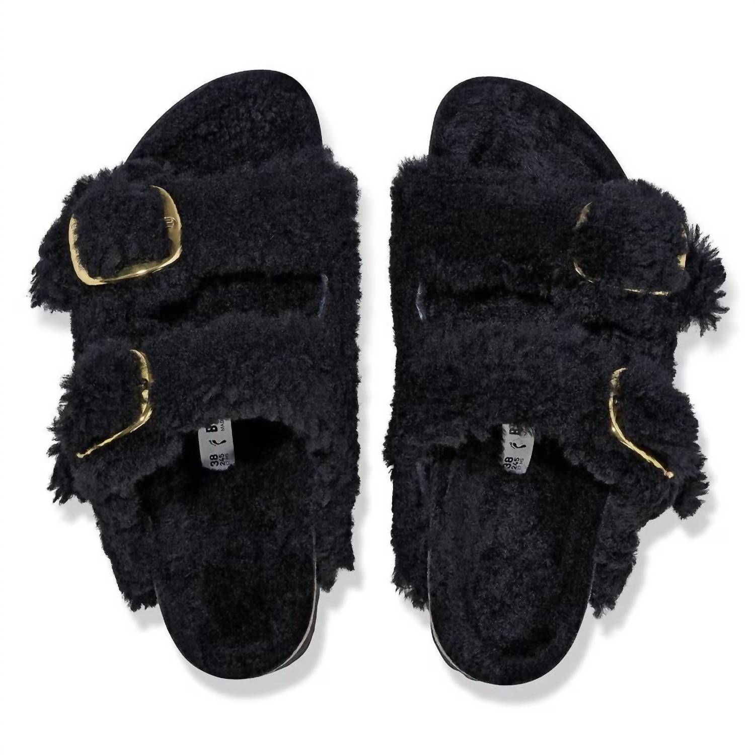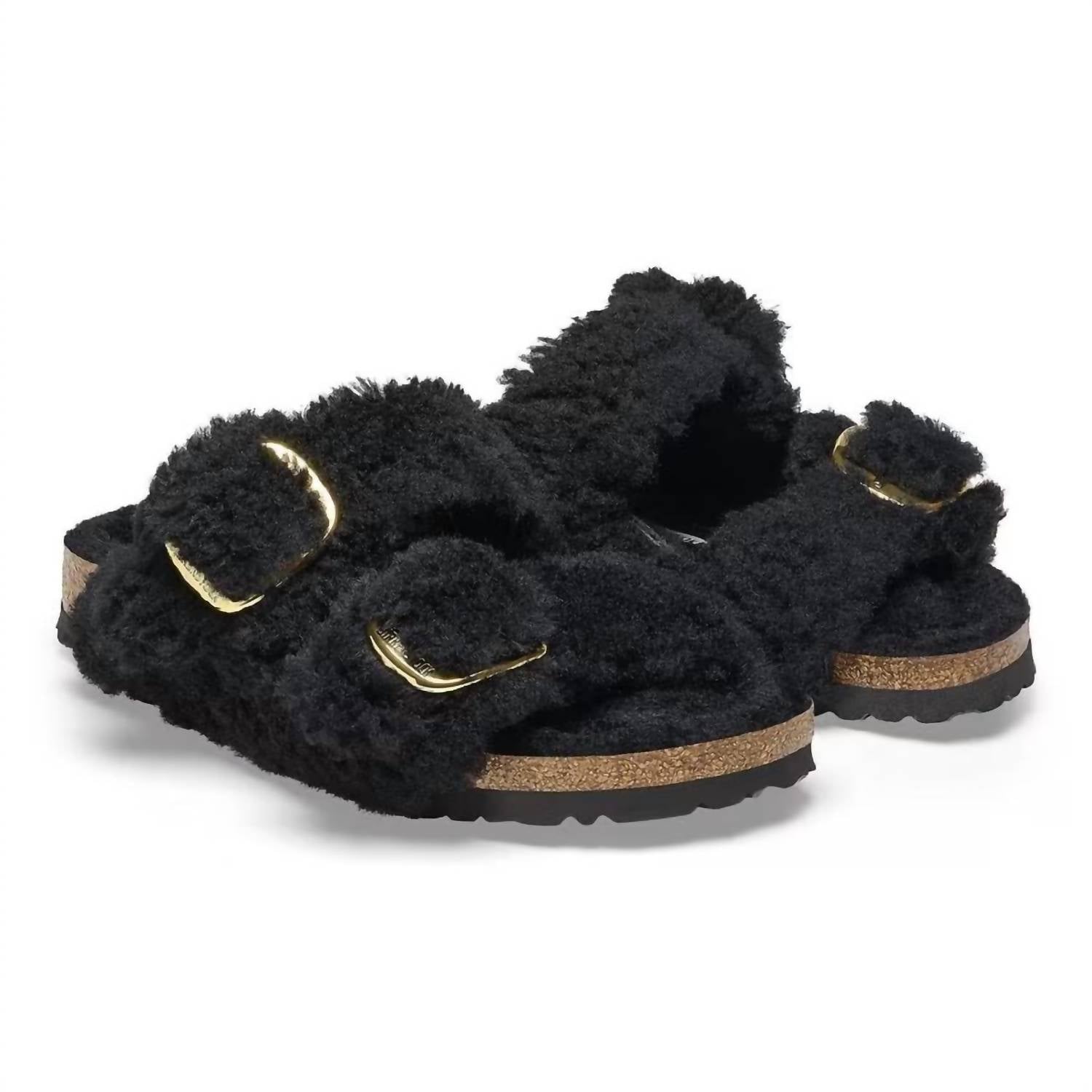Step into cozy luxury with the Women's Arizona Big Buckle Shearling Sandals by BIRKENSTOCK. Crafted from plush teddy shearling for both the upper and footbed lining, these sandals provide ultimate comfort. Featuring two adjustable straps with oversized metal pin buckles and a flexible, lightweight EVA sole, they offer both style and support. Made in Germany, these sandals also include a contoured cork-latex footbed that adapts to your foot's shape over time. Ideal for fall and perfect for a New Year's Eve housewarming, these sandals in Teddy Black offer a chic, flat design with a round toe.