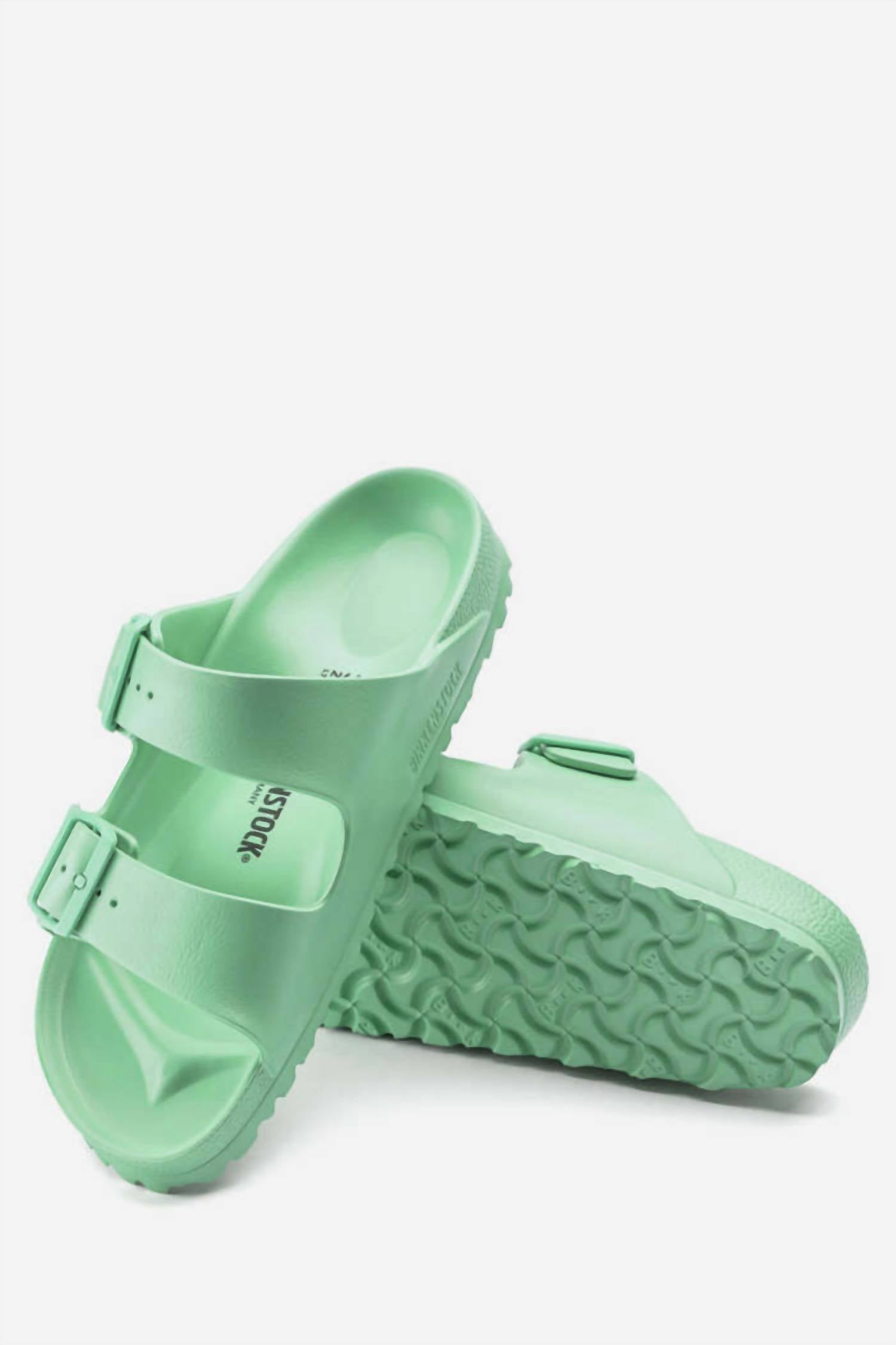 So comfy it's like you're walking on clouds. Experience the iconic style and comfort of BIRKENSTOCK with the Women's Arizona EVA 2 Slippers in Surf Green. These slippers feature an anatomically shaped footbed and a dual-strap design with individually adjustable pin buckles, all crafted from ultra-lightweight, molded EVA. Made in Germany, they are shock-absorbing, waterproof, and skin-friendly, making them perfect for the beach, garden, or post-gym relaxation. Enjoy the classic BIRKENSTOCK support with effortless care and versatility.