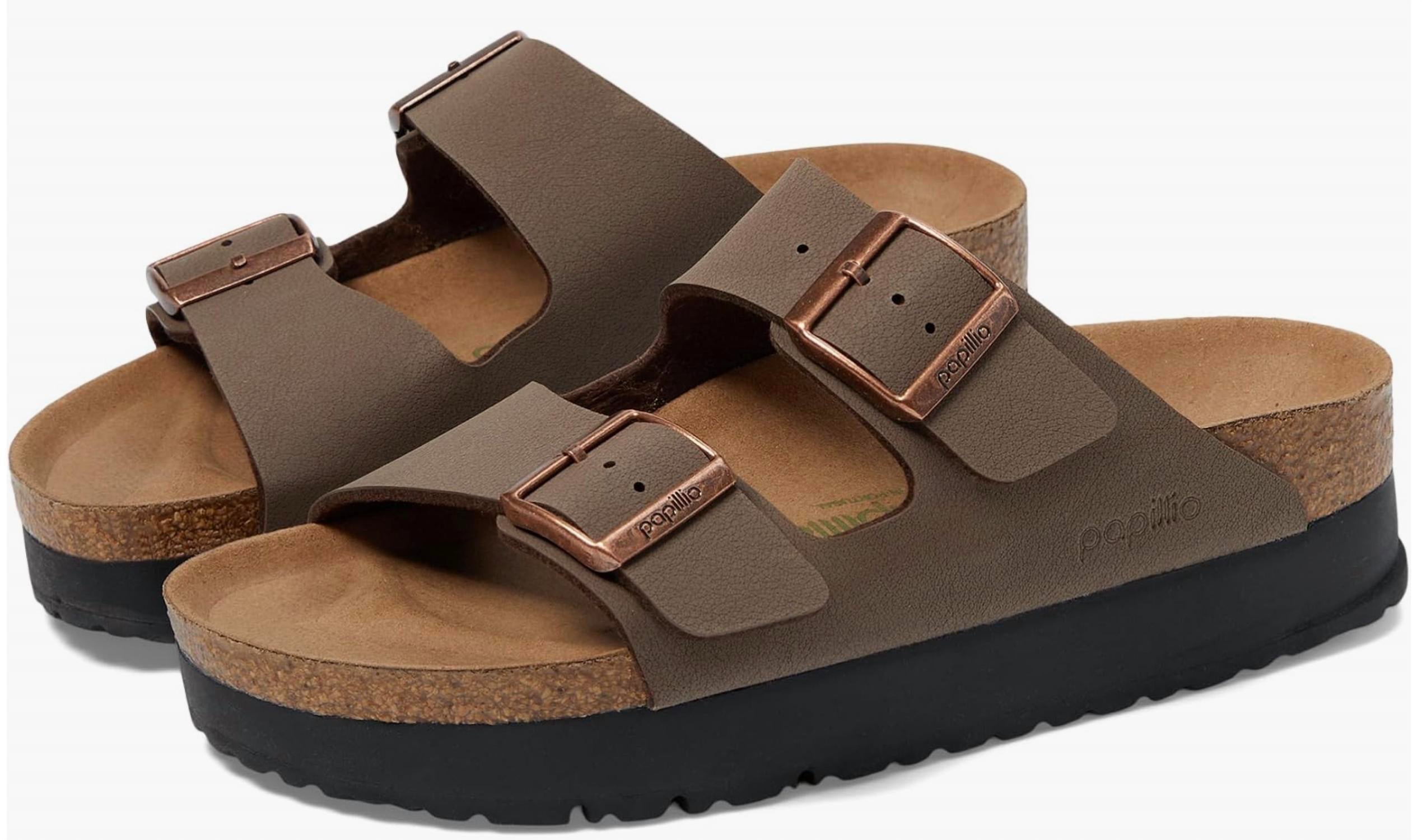 This sandal will take you from brunch to dinner and everything in between. Walk the toughest paths while being super comfortable wearing Birkenstock® Papillio by Birkenstock Arizona Platform Sandal - Vegan Flat Sandals. This slip-on footwear features a Birki-Flor synthetic upper construction with buckled straps, microfiber lining, and EVA cushioning cork footbed. Open almond toe. Cork\latex midsole. EVA platform outsole.
