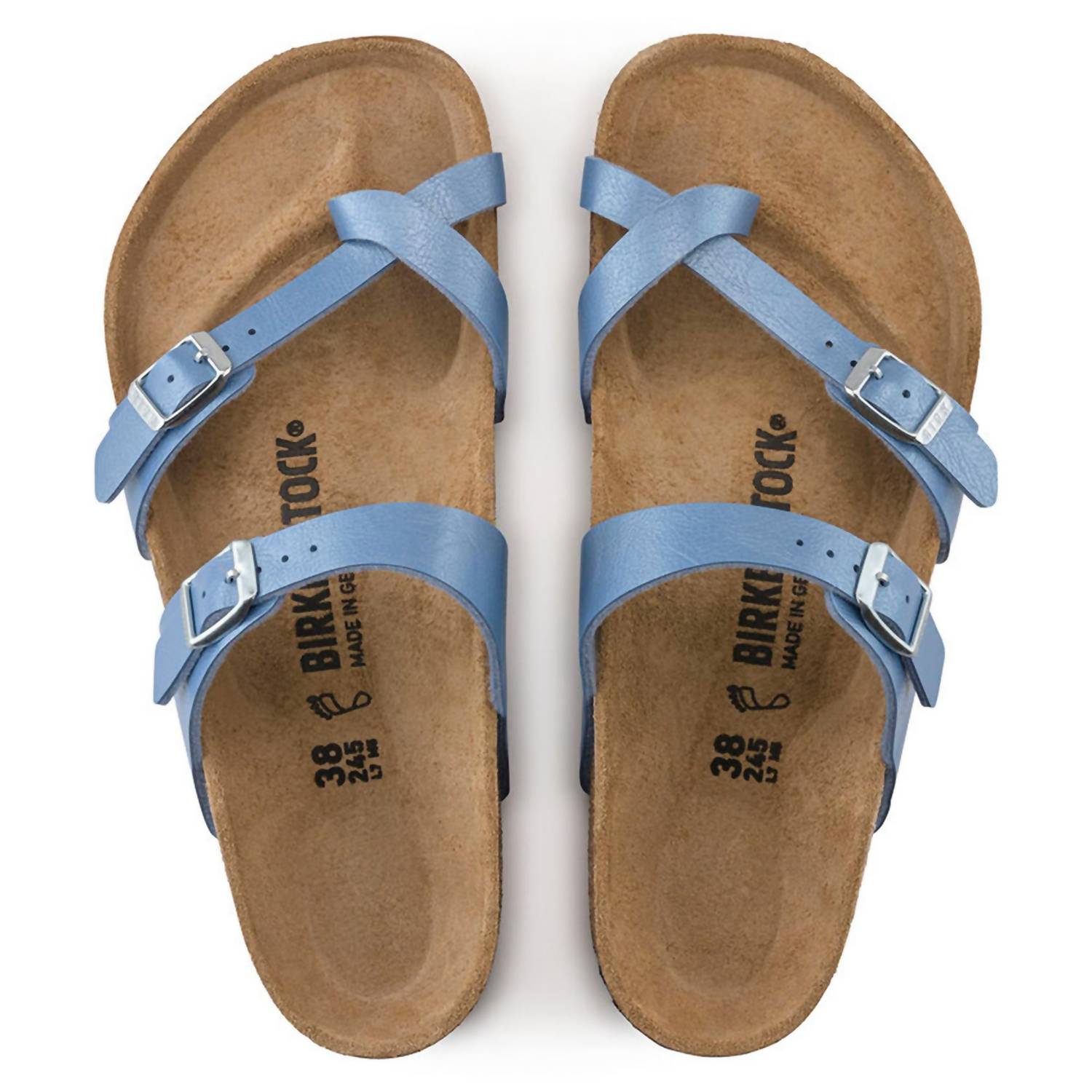 This sandal will take you from brunch to dinner and everything in between. Elevate your footwear collection with the Women's Mayari Sandal by Birkenstock, a perfect blend of elegance and comfort. Featuring adjustable, crisscrossing straps with an open toe design, this Riviera blue sandal provides classic support with a stylish frosted finish. Crafted from skin-friendly, hard-wearing Birko-Flor® material, it's made in Germany for superior quality. Ideal for those who seek both beauty and functionality in their footwear.