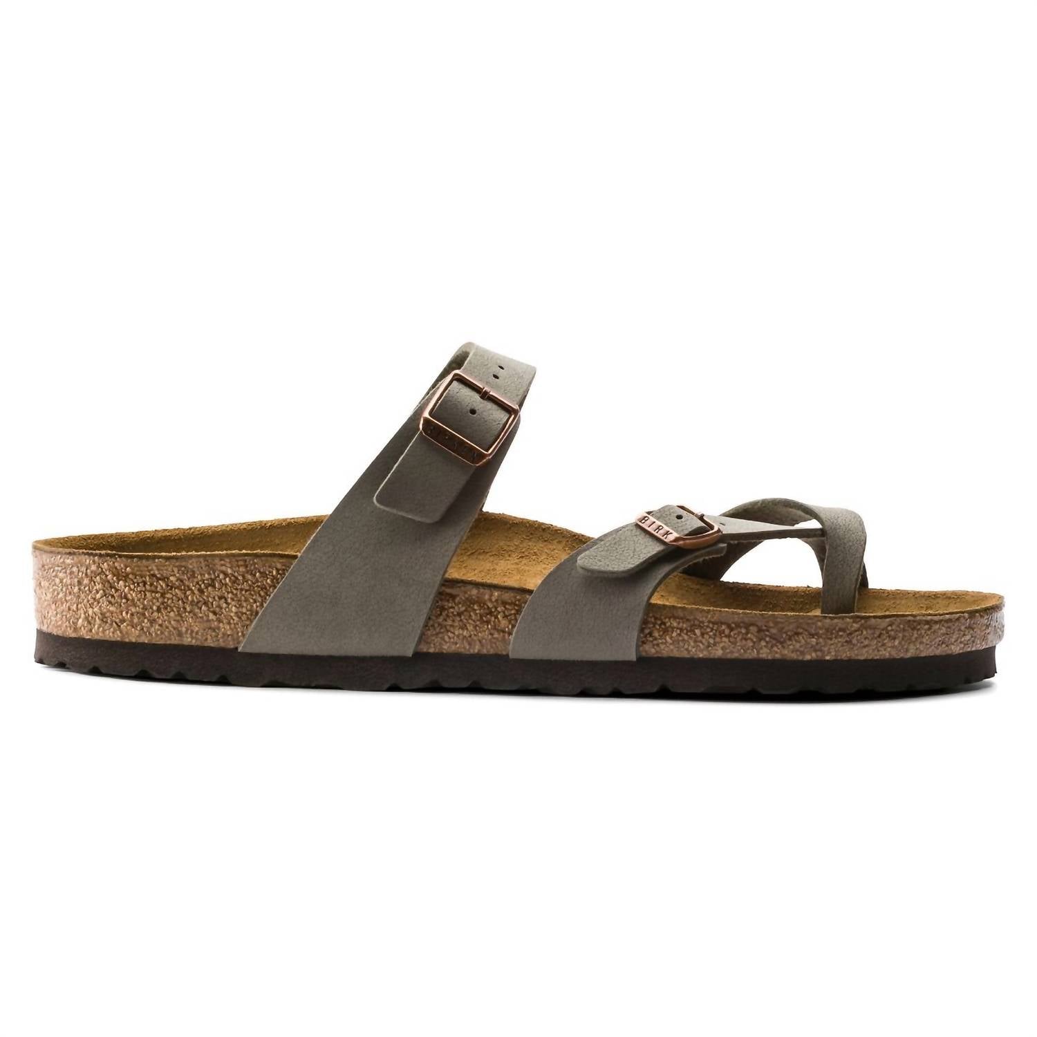 Meet the Women's Mayari Sandal by BIRKENSTOCK, combining style and function for fashion-forward women. This sandal features an anatomically shaped cork-latex footbed for ultimate comfort, and an upper crafted from skin-friendly, hard-wearing Birko-Flor® nubuck in a sophisticated stone hue. It includes two straps with individually adjustable metal pin buckles and a toe loop for a secure fit. Made in Germany, this sandal ensures both elegance and durability for all-day wear.