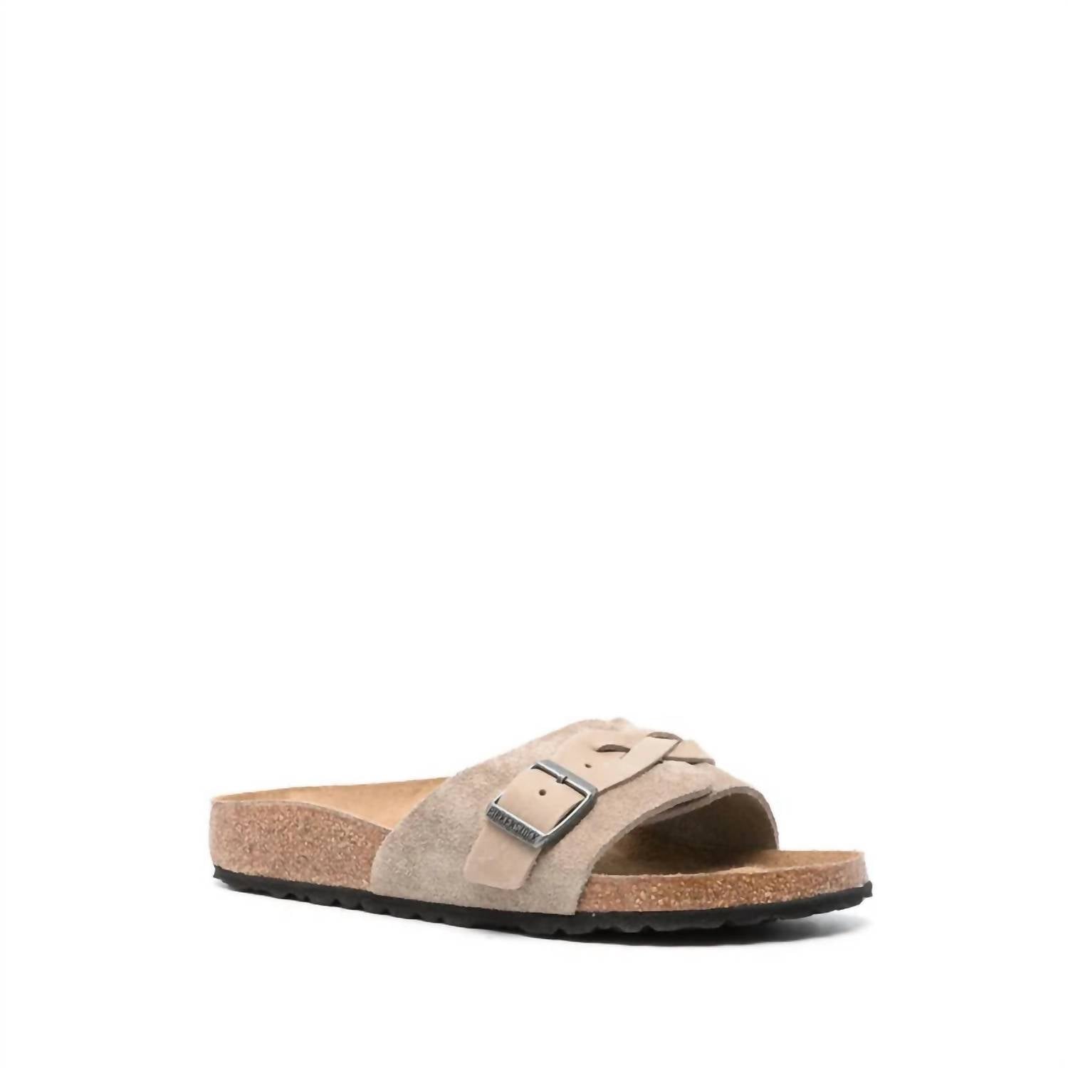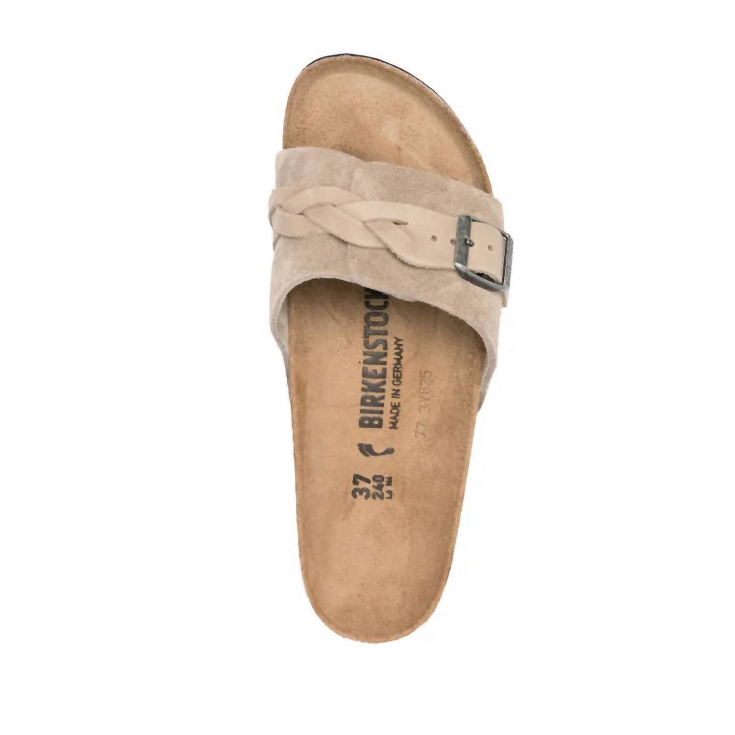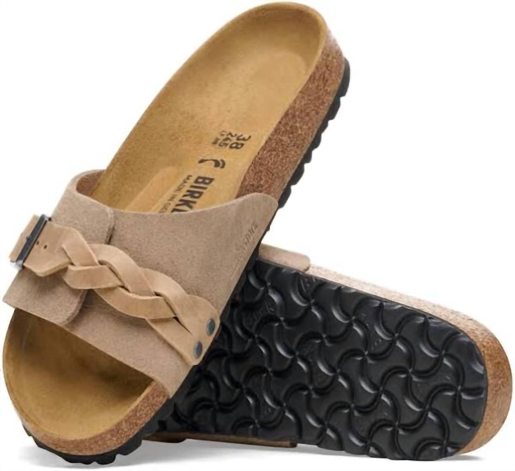 Classicly cute and all-day-wearable. We love this sandal. Elevate your warm-weather footwear with the Women's Oita Braided Sandal by BIRKENSTOCK in an elegant taupe. Crafted in Germany, it boasts a classic suede upper with an oiled leather, boho-inspired braided strap. The open-toe design features a contoured cork-latex footbed that offers custom support and comfort with wear, complemented by a flexible EVA sole. Enjoy the perfect fit with its hook-and-loop strap and adjustable metal pin buckle closure.