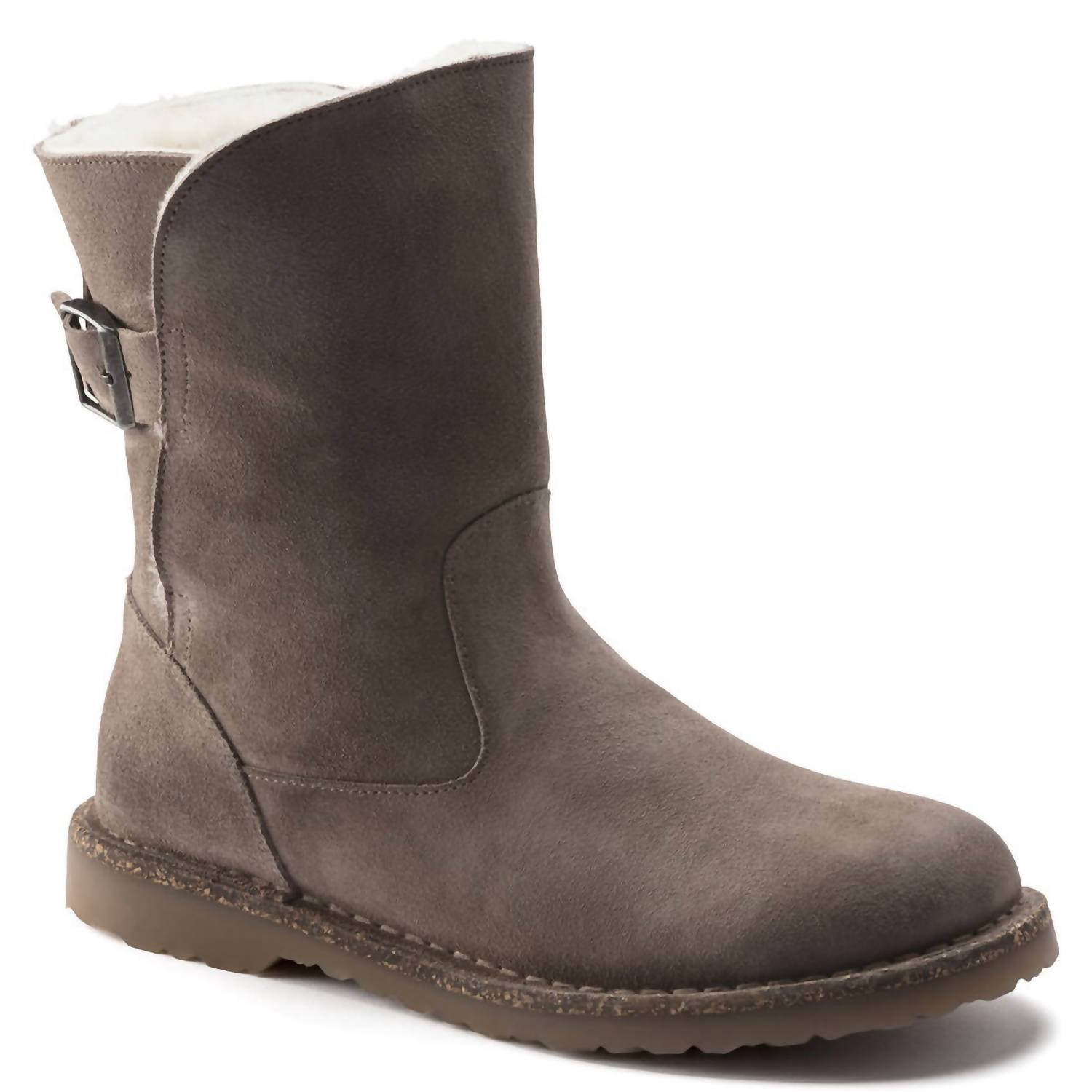 Say hello to the perfect, most versatile boot. The ankle height makes this style easily transition from day to night. Wear them with your favorite skinny jeans and tee for a more laid back look, or pair them with your favorite mini dress and jacket for a night out on the town. Unveiling the BIRKENSTOCK Women's Uppsala Shearling Mid-high Boot in elegant Gray Taupe, perfect for chic comfort as temperatures drop. With a cozy genuine shearling-lined mid-high design, this boot offers warmth and a removable anatomically shaped cork-latex footbed for personalized support. Crafted from especially soft suede, the shoe is set on a durable TR rubber sole ensuring excellent grip. Made in Portugal, this boot delivers unmatched style and support without sacrificing comfort.