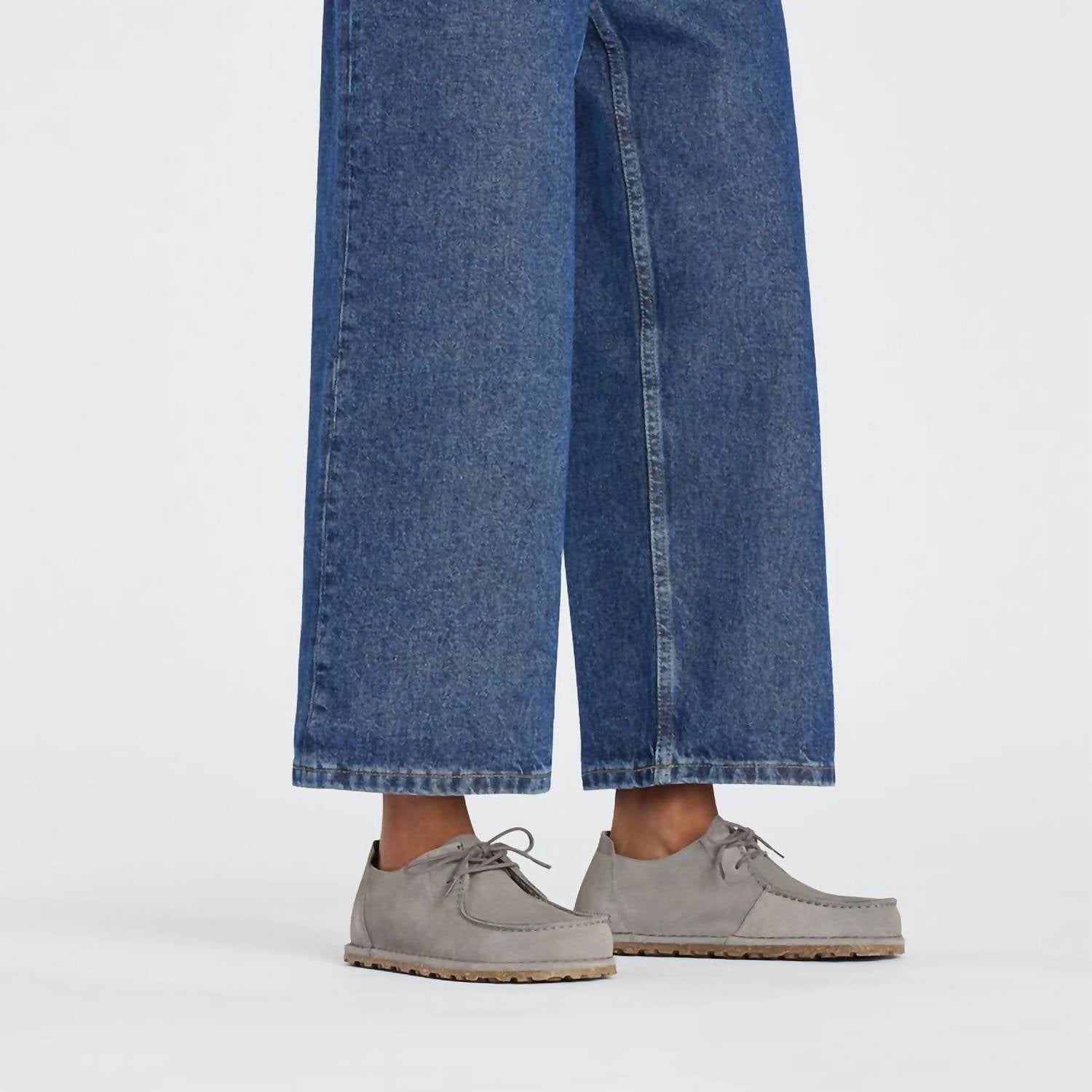Experience unparalleled comfort with the Women's Utti Lace Shoes by BIRKENSTOCK, crafted in captivating Whale Grey. These moccasin-inspired shoes feature a classic suede upper, offering a velvety surface with high moisture absorption. Designed for travel, they boast a microfibre insole and a polyurethane footbed that supports natural walking motion, complemented by a natural cork and rubber blend sole for traction. Embrace 90s fashion with these flat-heeled shoes, perfect for your spring adventures.