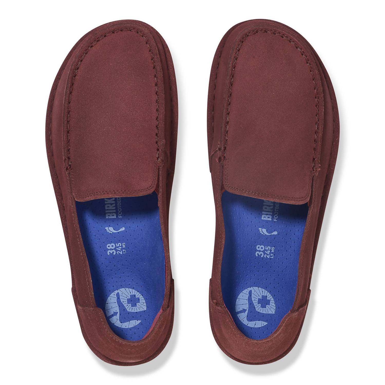 Slip them on and go! Step into ultimate comfort with the Women's Utti Suede Clogs by BIRKENSTOCK, crafted in a luxurious suede material and available in the rich Zinfandel color. With an easy-on heel tab, these clogs offer a seamless experience, enhanced by a premium Deep Blue footbed designed for optimal support and a moisture-wicking lining. The round toe shape and medium shoe width ensure a comfortable fit, while the low (1 1/4"-2") norm heel height complements a natural walking motion.