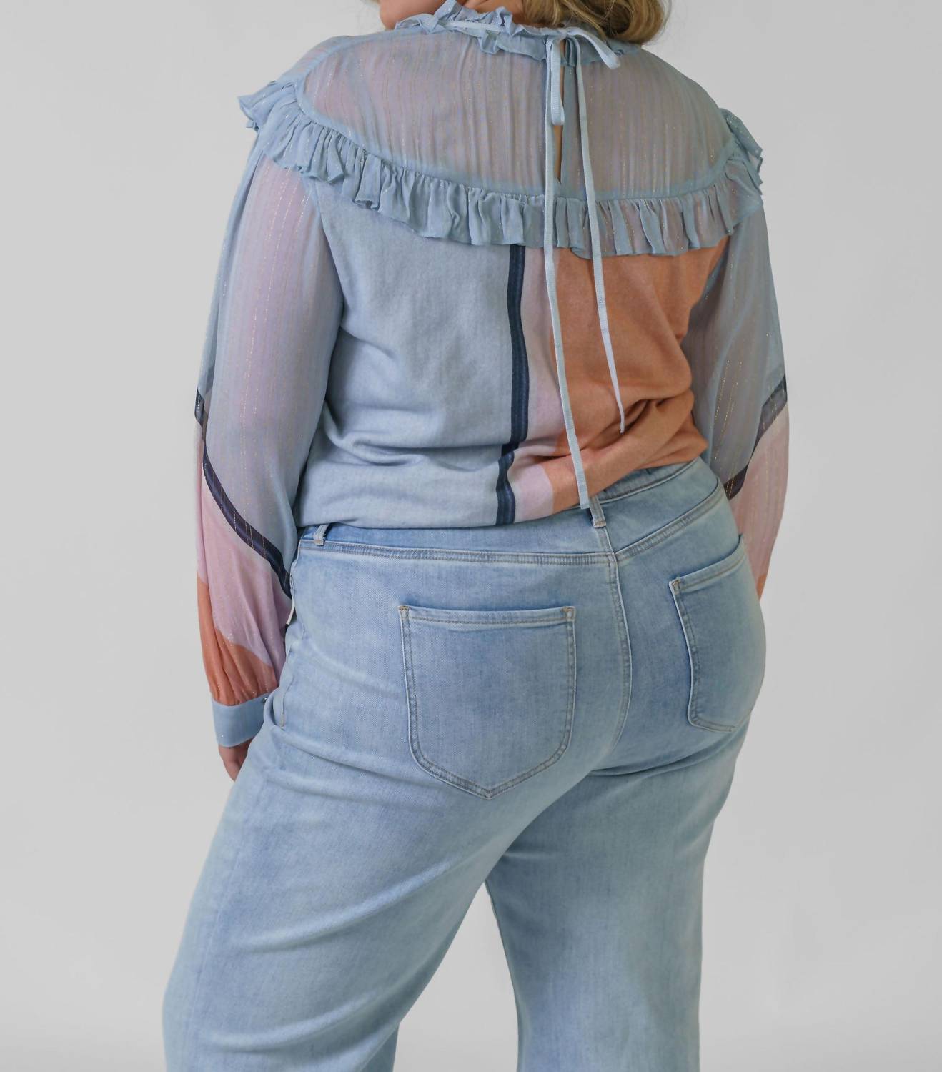 Elevate your spring wardrobe with the -bl^nk- Kalani Knitted Top in light blue, designed for plus sizes. This long sleeve top features a mockneck, offering a vintage-inspired flair perfect for a dinner party. Crafted from a viscose blend, this patterned blouse combines 45% viscose, 5% lurex knitting, 25% cotton, and 25% melange for exceptional softness and comfort. Closure: Tie closure. Care: Dry clean only.