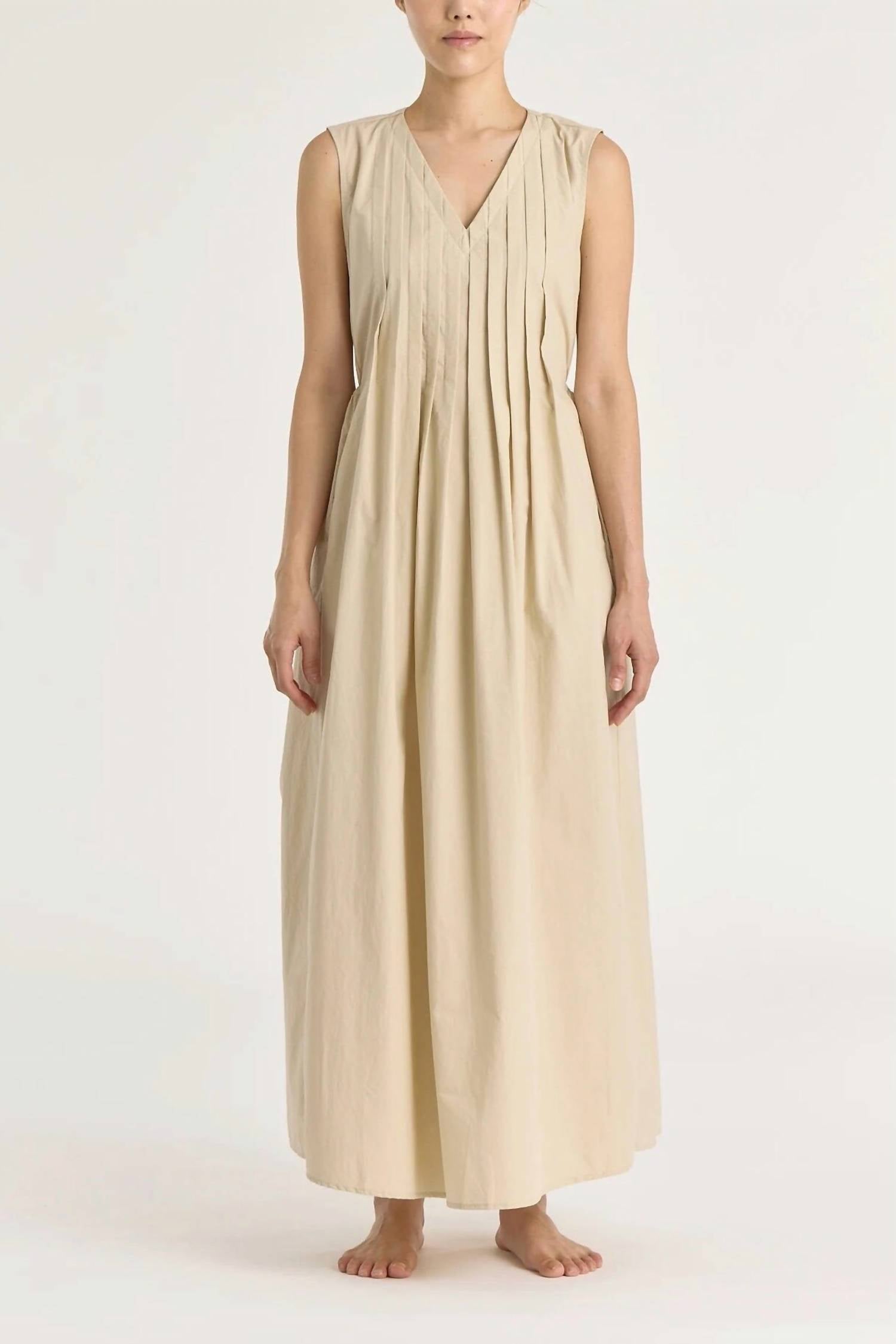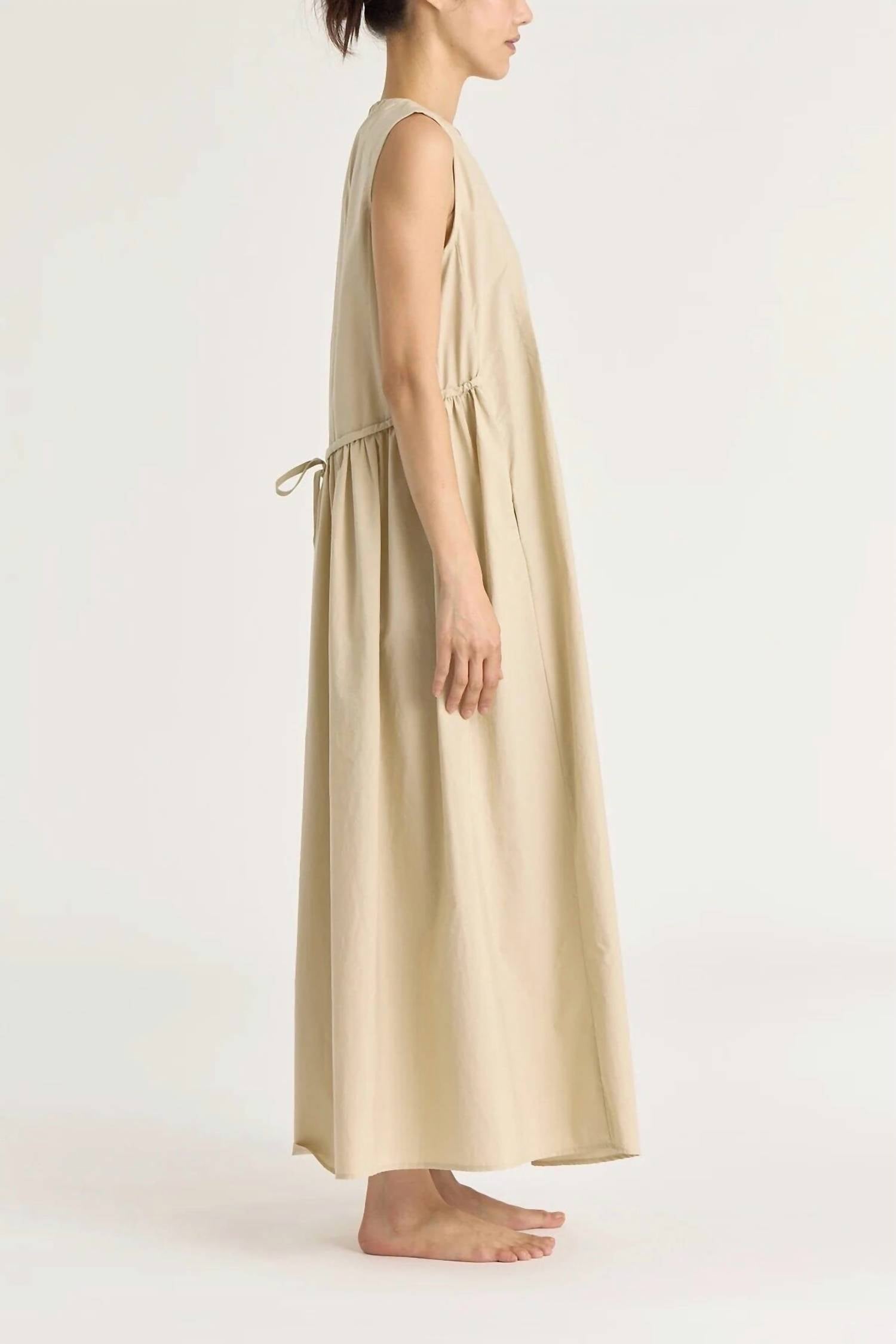 Style this maxi with your favorite statement necklace and sandals for the perfect look. Discover the Pleated V Neck Maxi Dress by Black Crane, an elegant choice in an Oyster hue designed for summer sophistication. This sleeveless, solid shift dress is expertly crafted from 100% organic cotton, featuring front pleating and a relaxed fit. Made in the USA, it includes an adjustable back drawstring to tailor the silhouette to your liking. It’s easy to care for—machine wash cold and tumble dry low. Model is 5'6" wearing size S (32" chest, 24" waist, 34" hip).