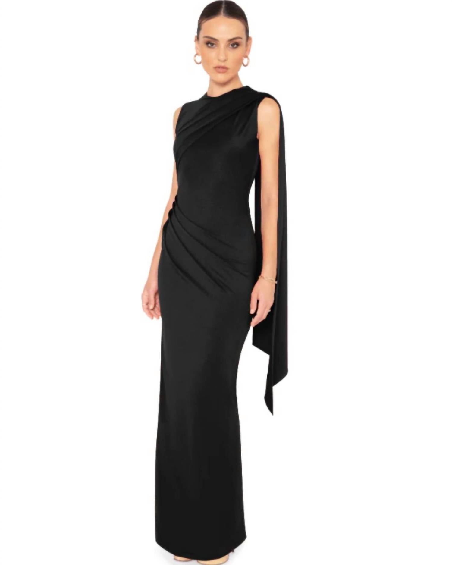 Elevate your vacation wardrobe with the Aruna Maxi Dress by Black Halo, a chic sheath silhouette perfect for summer getaways. This sleeveless design features a high mockneck elegantly draped with a scarf, complemented by a side slit for added allure. Crafted in a solid monochrome hue, it promises a flattering fit with a comfortable stretch. Closure: Back zip. Care: Dry clean only.