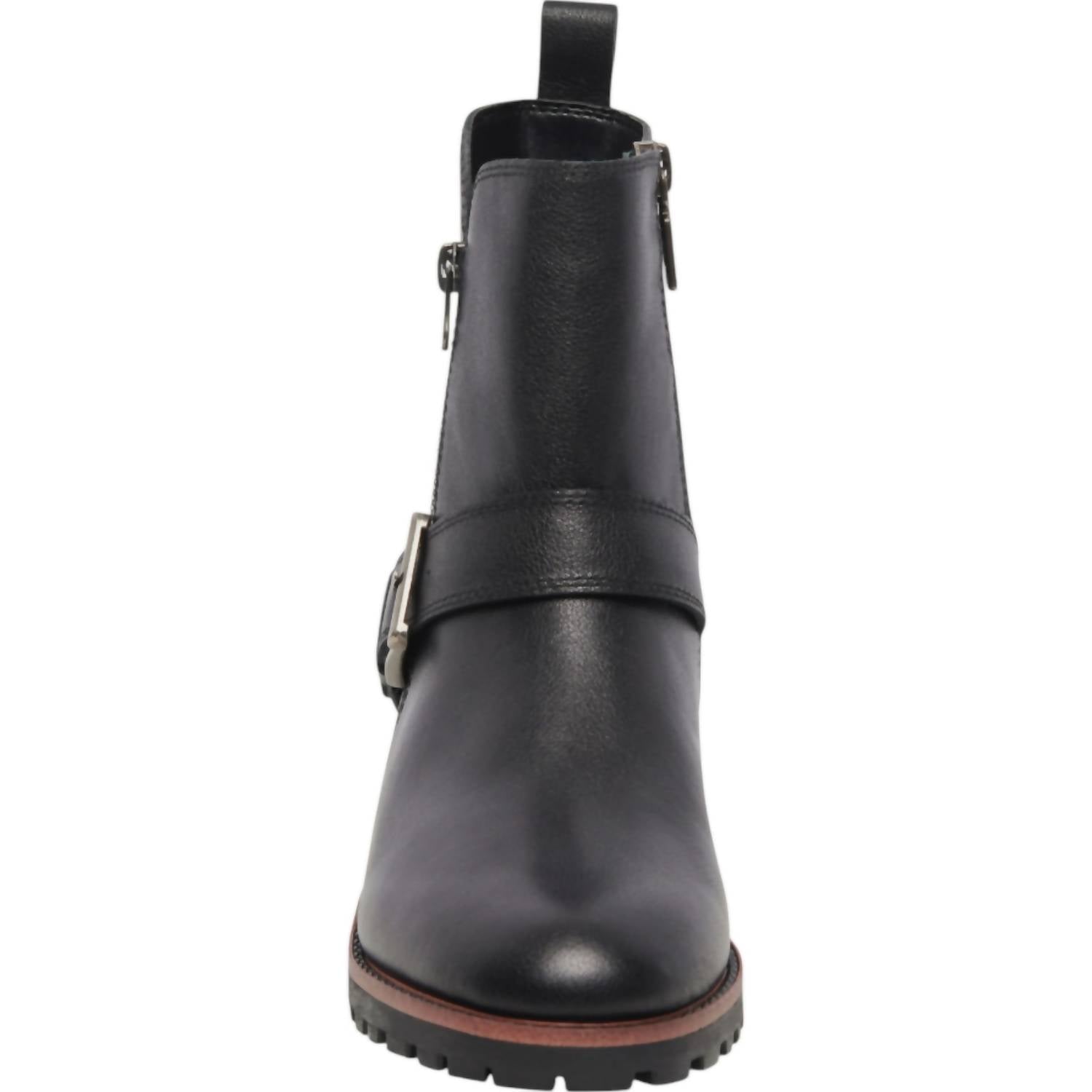 Step out in style crafted in sleek black leather. Boast an industrial vibe with a buckled strap and dual zippers, set on a chunky lugged sole. Waterproof design ensures your feet stay dry. Featuring a 1 1/2" heel and 1/2" platform with a 5 3/4" shaft height. Leather upper, textile and synthetic lining, rubber sole. Perfect for wet conditions while adding a bold touch to your look.
