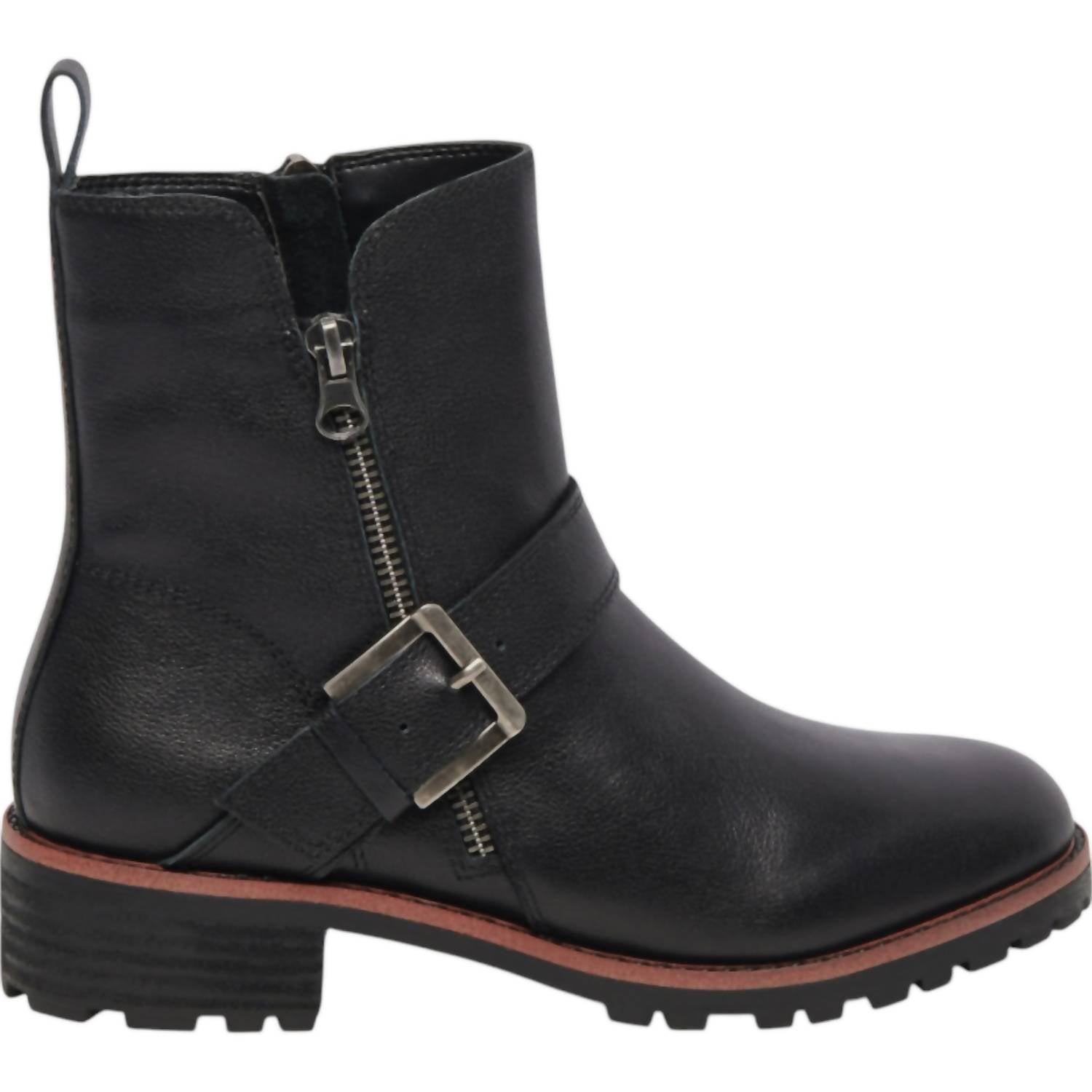 The most effortlessly cool moto boots that are just a comfortable as they are easy on the eyes. Step out in style crafted in sleek black leather. Boast an industrial vibe with a buckled strap and dual zippers, set on a chunky lugged sole. Waterproof design ensures your feet stay dry. Featuring a 1 1/2" heel and 1/2" platform with a 5 3/4" shaft height. Leather upper, textile and synthetic lining, rubber sole. Perfect for wet conditions while adding a bold touch to your look.