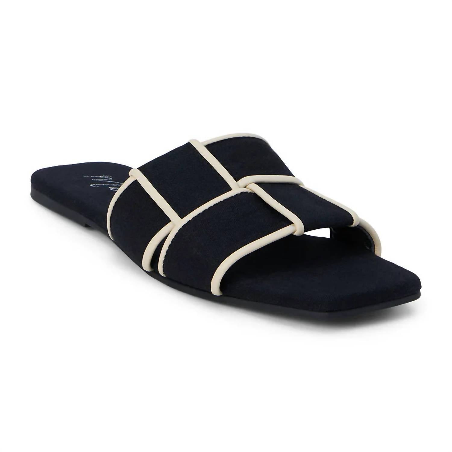Flowy dresses, cropped pants, and even jumpsuits... this sandal works with them all! Step into understated elegance with the Women's Biscayne Slide Sandal by Blossom Footwear, crafted for a minimalist and chic summer style. These sandals feature a flat heel and an open toe, with a woven band for added texture. The composition includes a linen and leather upper with a manmade outsole and leather lining, complete with a padded insole for comfort. Slip-on style and imported quality ensure easy wear and a sophisticated finish in classic black.