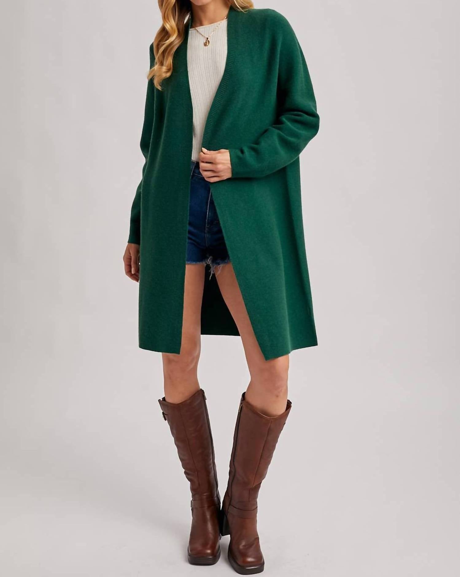 A classic fit that works just as good buttoned as it does left open. Discover the BluIvy Open Front Knit Layering Sweater Cardigan in Hunter Green, a perfect addition to your holiday party wardrobe. Crafted from a sophisticated blend of 30% Polyester, 20% Nylon, 26% Acrylic, and 24% Modal, this cardigan boasts a seamless WHOLEGARMENT construction for a comfortable and elegant fit. The longline design drapes beautifully to mid-thigh or just above the knee, featuring long, straight sleeves and a continuous ribbed trim for added style. Experience the refined silhouette and sustainable craftsmanship this cardigan offers without the need for sewn seams. Model is 5'9" and wearing a S/M.