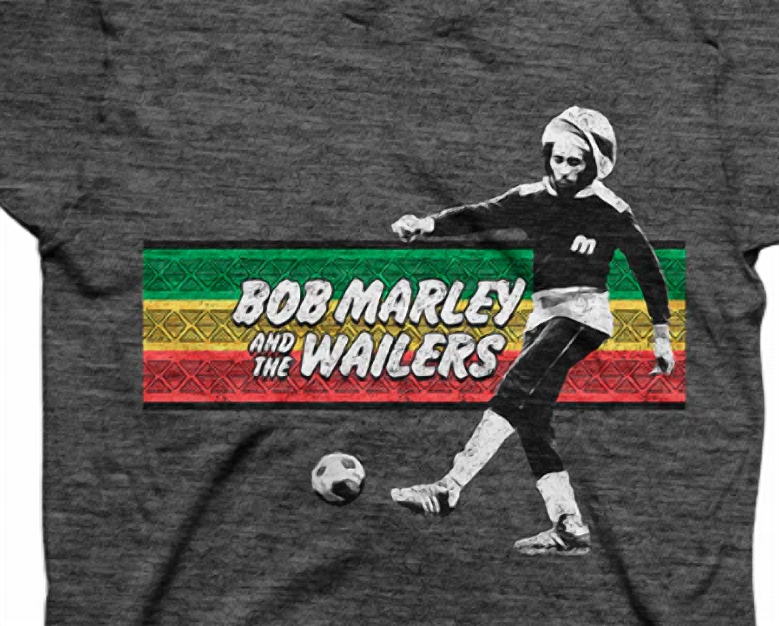 Embrace casual style with the Men's Soccer Rasta Stripe T-shirt by Bob Marley, crafted in a unique charcoal blend of cotton, polyester, and rayon. This short sleeve crewneck tee features an expressive graphic pattern, showcasing a rasta stripe and Bob Marley kicking a soccer ball. Designed for pull-on ease, this tee embodies a relaxed vibe perfect for streetwear trends and holiday parties. Ideal for summer occasions, it's a testament to the reggae legend's spirit.