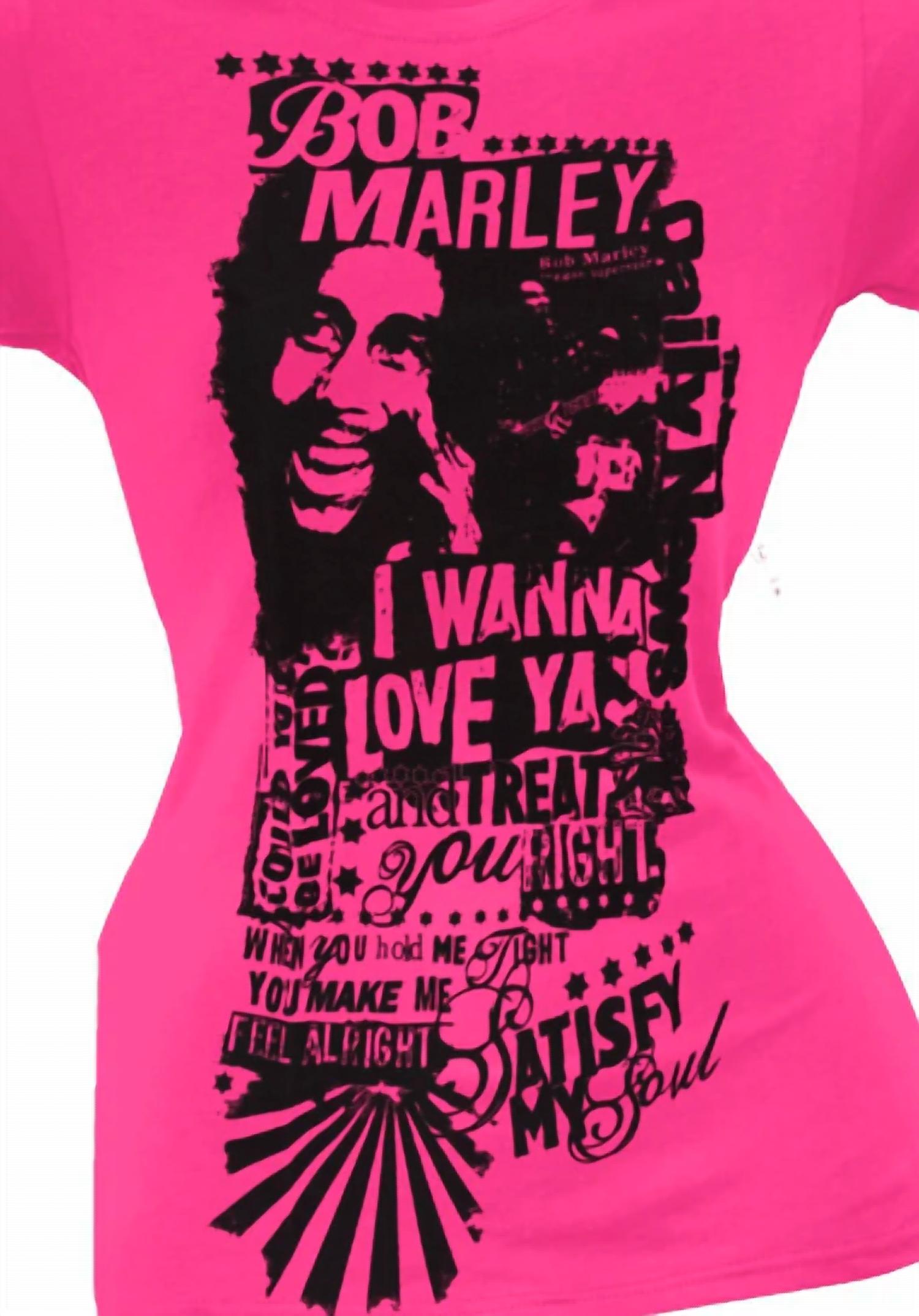 Celebrate your love for Bob Marley with the Women's Wanna Love Ya T-shirt by Bob Marley, showcasing a pink hue with iconic sayings like "I wanna love ya" and "You make me feel alright" on the front. Featuring short sleeves and a crewneck, this t-shirt is crafted from cotton, ensuring comfort during summer and holiday parties. Closure: Pull on. Ideal for streetwear enthusiasts and Thanksgiving celebrations.
