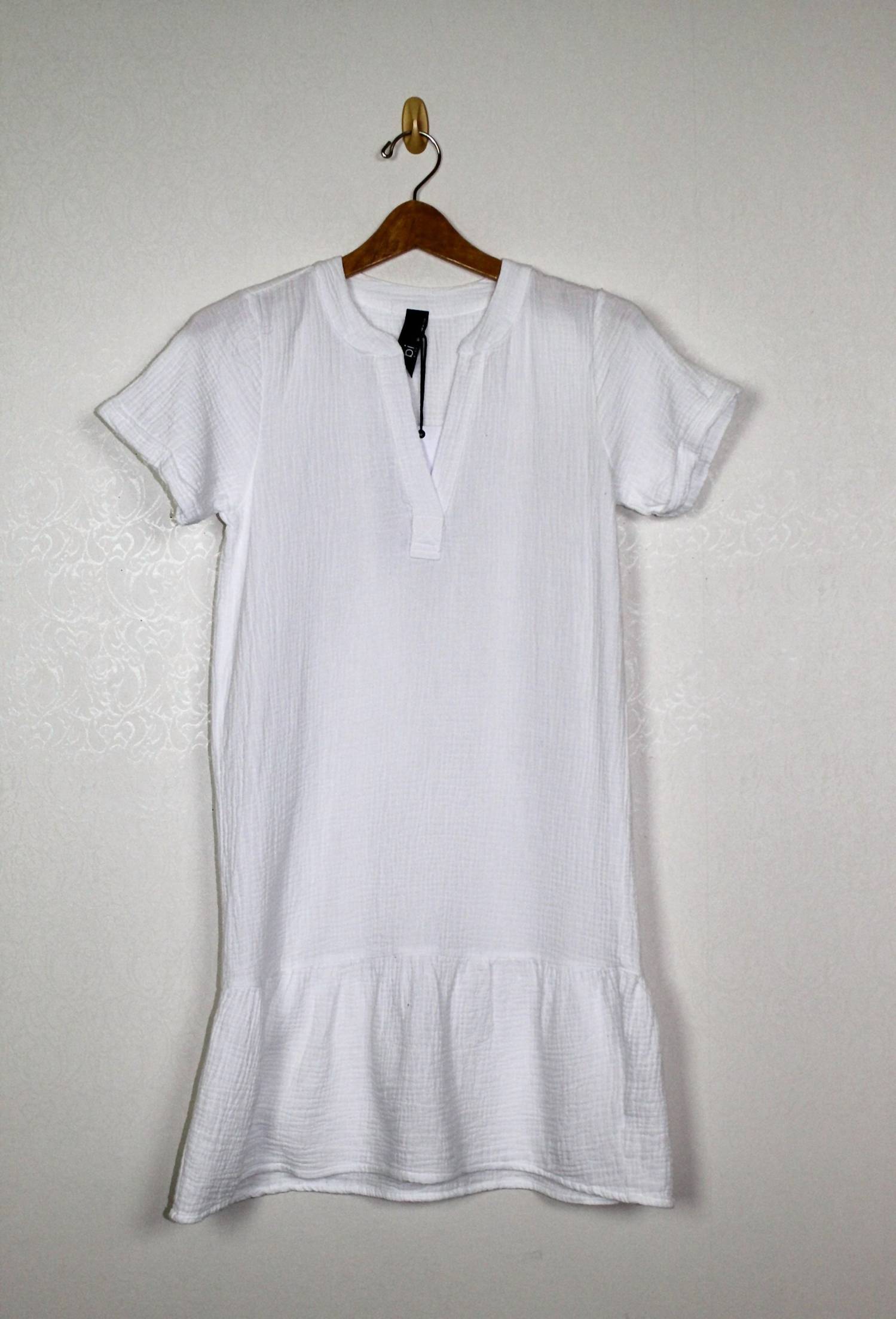 A short and breezy dress for those warmer days. Step into summer with the Bobi Split Neck Ruffle Hem Dress, a vacation-ready essential in crisp white. Crafted from 100% cotton for breathable comfort, this A-line mini dress features short sleeves and a playful ruffle hem. Designed in a chic solid pattern, it offers a V-neck with a split detail for a touch of elegance. Originating from China, this dress is easy to wear with its pull-on closure and conveniently machine washable.