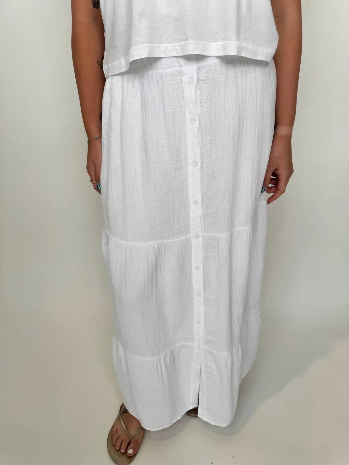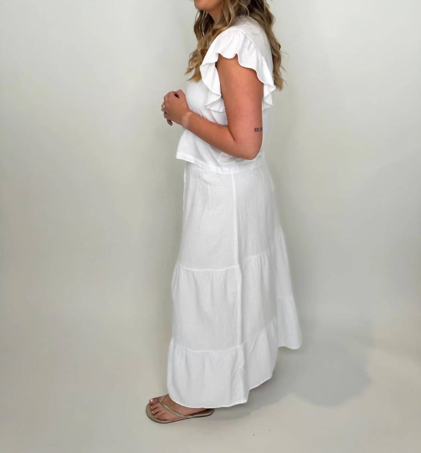 Who doesn't love a good maxi skirt? Elevate your summer wardrobe with the Bobi Tiered Maxi Skirt, offering a chic and minimalist appeal. Crafted from 100% Cotton, this comfortable skirt features a tiered design in versatile White, perfect for vacations. The pull-on closure and elastic waist ensure ease of wear, making it a practical choice for warm days. Care for your skirt by machine washing with like colors and tumble drying low.