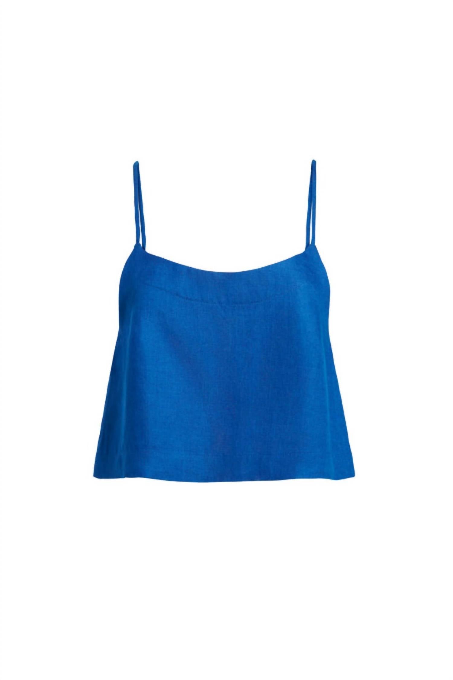 The perfect tank top for those warmer weather seasons. Elevate your wardrobe with BONDI BORN's Women's Flared Cami in a stunning sapphire hue. This elegant cami features spaghetti straps and a crewneck design, perfectly flaring at the waist for a flattering silhouette. Crafted from 100% linen, this top is ideal for pairing with high-waisted skirts, pants, or shorts. Its pull-on closure ensures easy wear while maintaining effortless style.