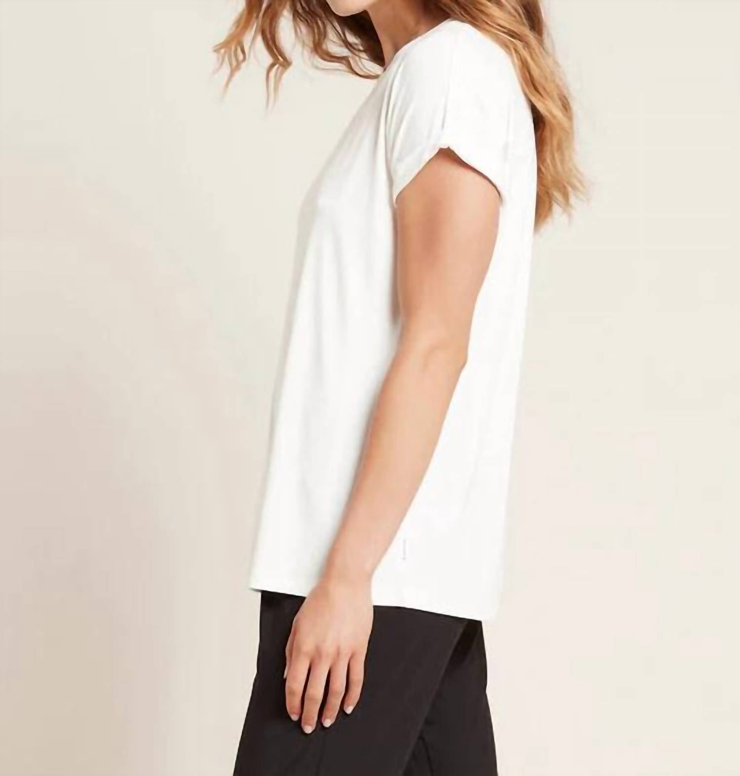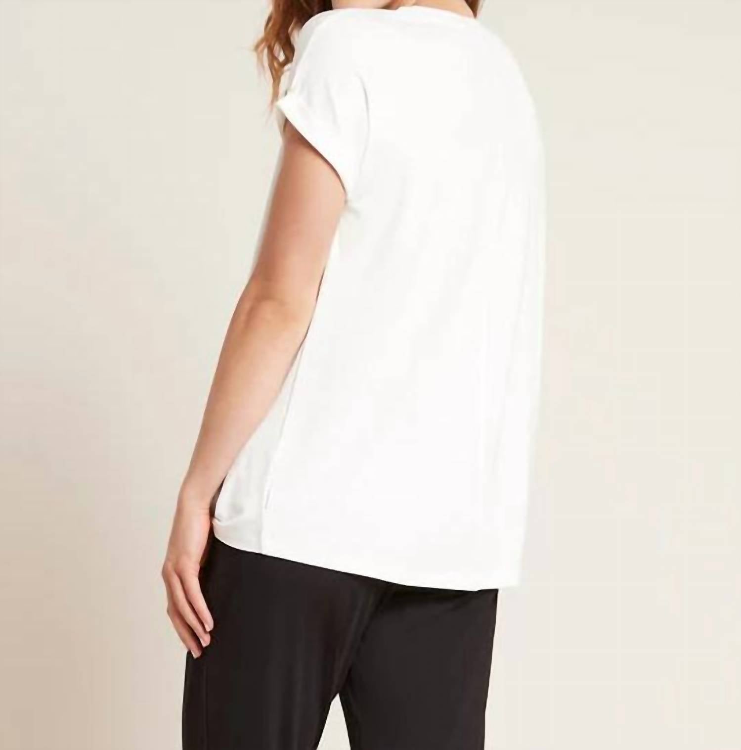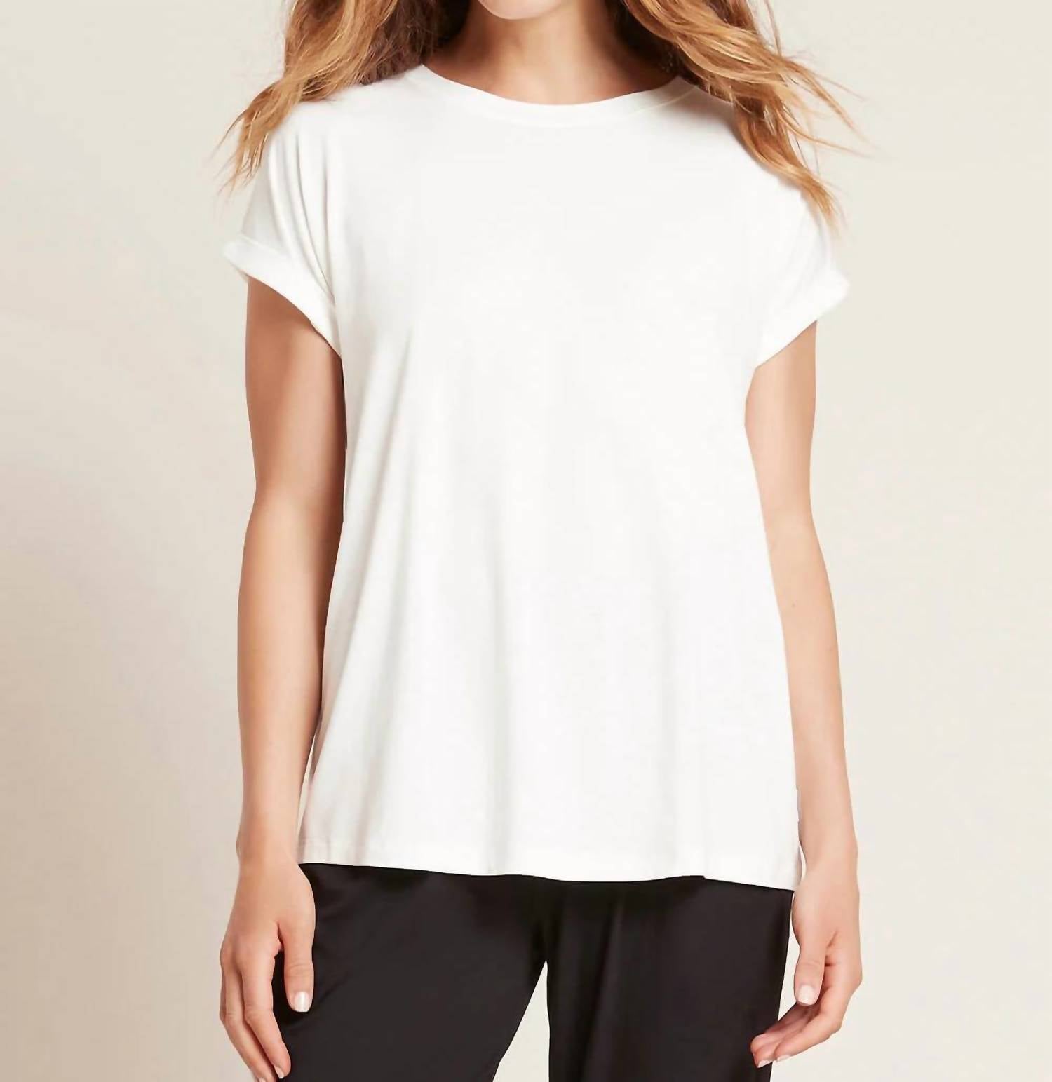 The short sleeve tee you'll want in every color. Experience the Downtime Lounge Top by Boody, a minimalist essential in Natural White for your loungewear collection. Crafted with short sleeves and a breathable 95% Viscose, 5% Elastane, this top offers comfort with its lightweight construction. Its pull-on closure and high-to-low curved hem add a relaxed charm, perfect for summer gatherings. Care instructions recommend machine washing warm, with tumble dry low or line dry in shade for easy maintenance.