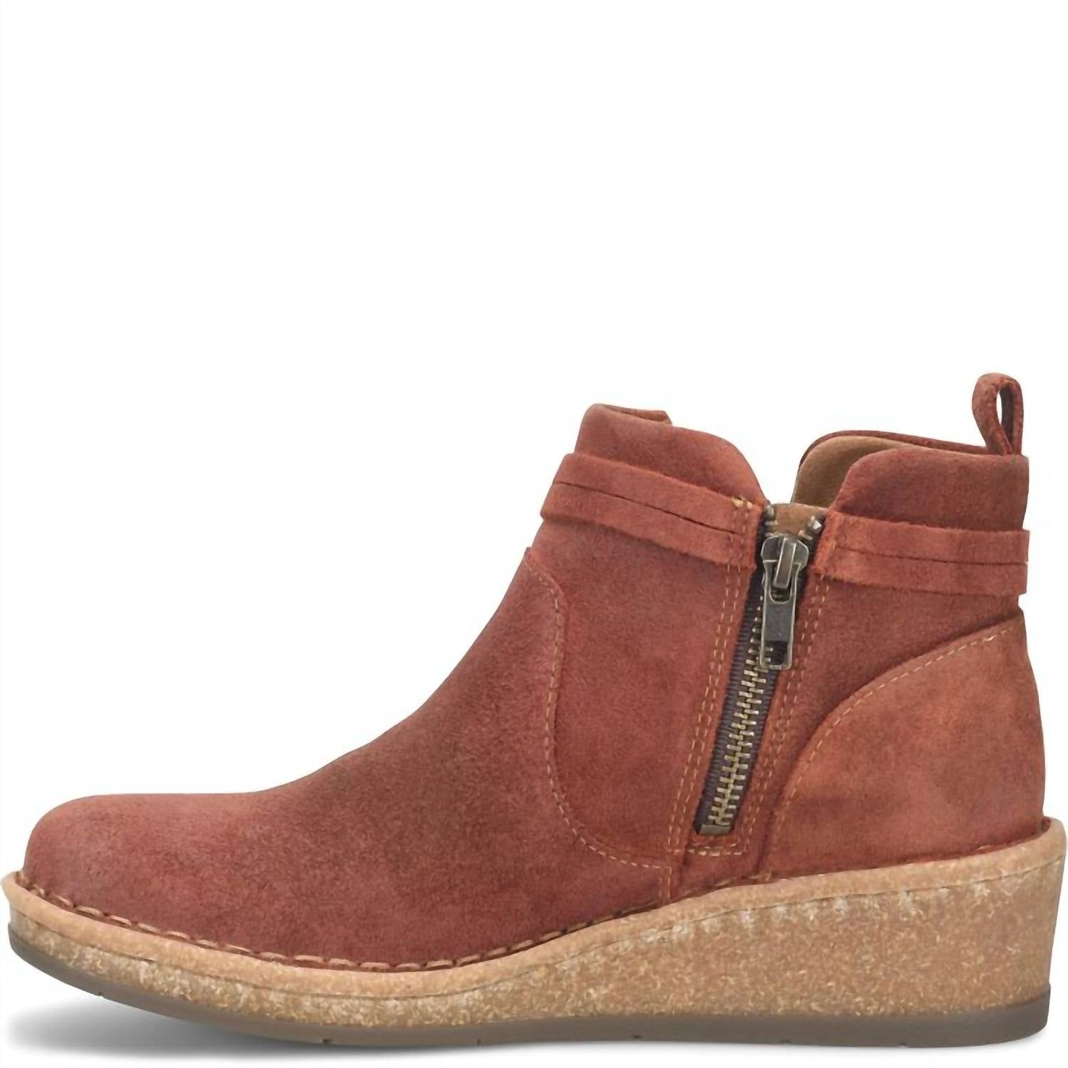 Step into elegance with the Women's Vaughn Distressed Suede Leather Bootie by Born, a perfect choice for fall fashion. These rust-colored boots feature soft hand-finished distressed suede leather uppers and breathable soft leather linings, offering both style and comfort. With a mid-heel height of 2 inches and a comfortable platform of 3/4 inch, these booties boast a 2-way Opanka handcrafted construction and a lightweight rubber outsole for high traction. For a natural, ultra-flexible fit, the booties include a cushioned microfiber-covered footbed with extra foam, making them ideal for various occasions, from workwear to music festivals.