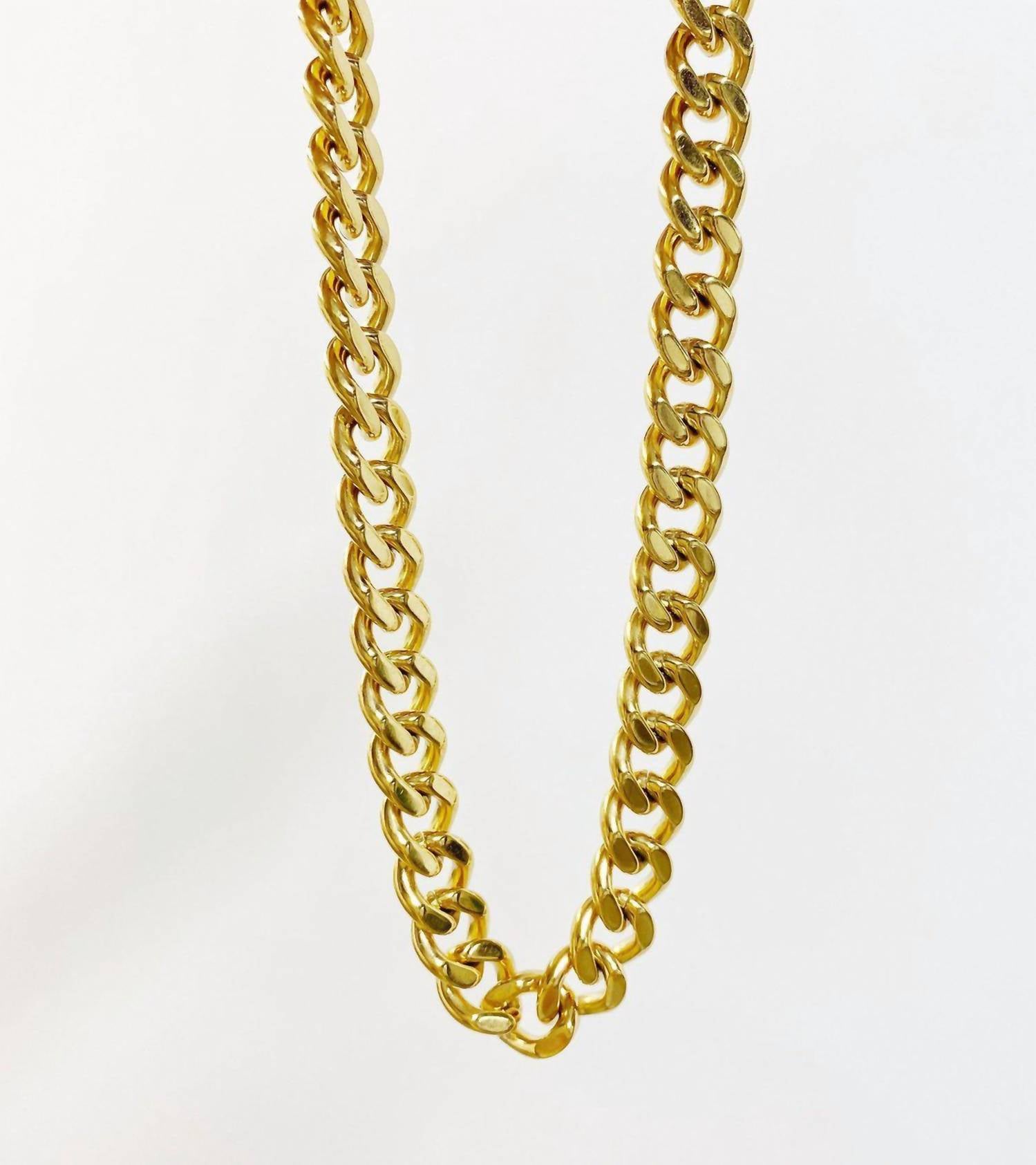 The perfect stand-out necklace that complements even the most basic t-shirt. Introducing the Women's Clyde Necklace by BRACHA, a chic fashion statement crafted with 16k gold plating over stainless steel for durability and elegance. This thick Cuban link gauge necklace offers a 15.5" length, ideal for layering or wearing solo. It is designed to be both water and tarnish resistant, ensuring it retains its sparkle through every season. Elevate any outfit effortlessly with this versatile piece in stunning gold.