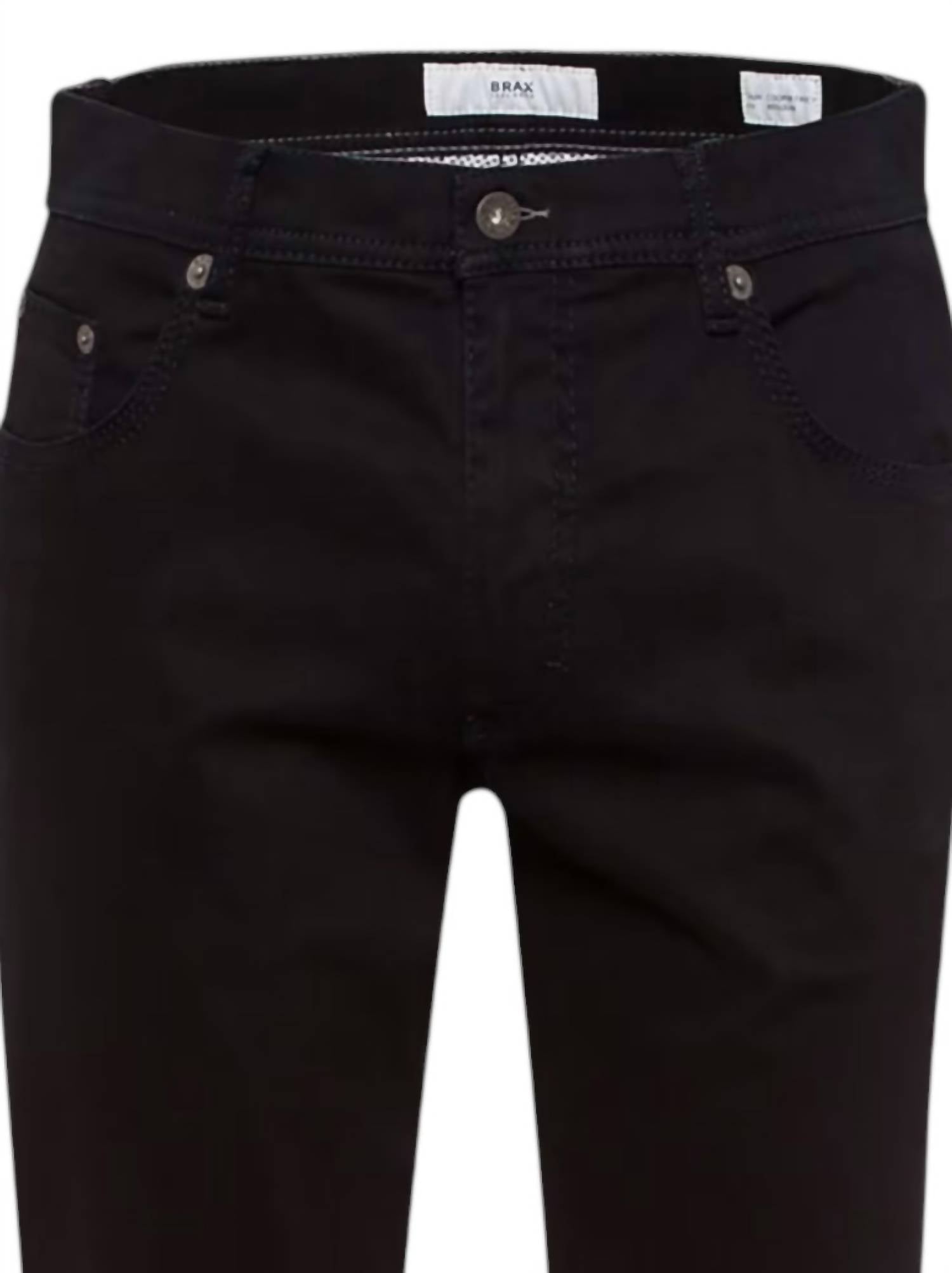 Crafted by Brax, the Men's Cooper Fancy Five-pocket Pants in sleek black embody a sophisticated monochrome style. Made from a skin-kind cotton mix and enhanced with innovative elastane for superior comfort and movement, these pants offer a luxurious feel with a soft, satin finish. Featuring a straight leg design with a regular mid-rise fit, they boast a high-quality button closure and classic five-pocket style, including slit pockets, patch back pockets, and a handy coin pocket. Easy to care for, simply machine wash and tumble dry for convenience.