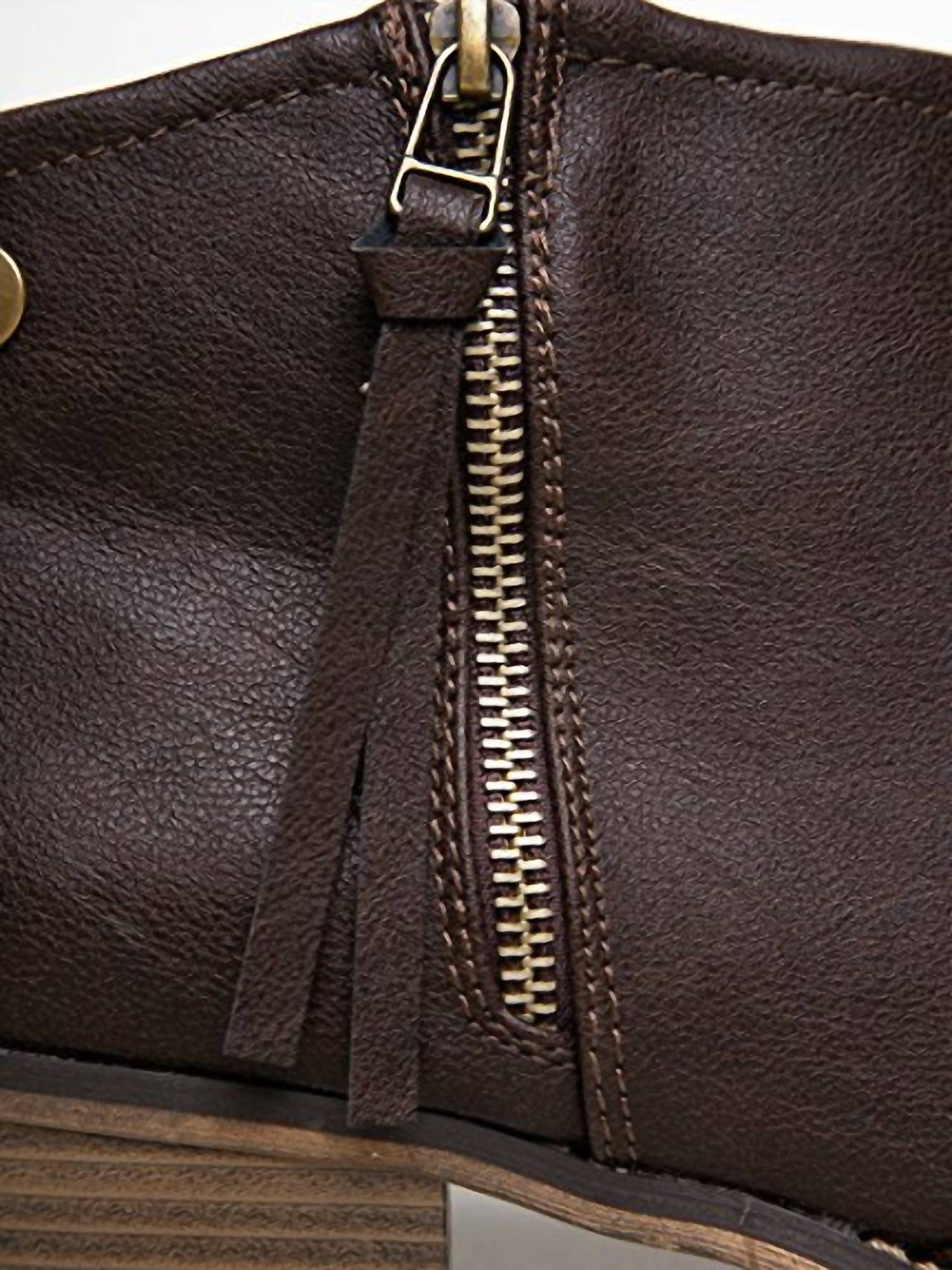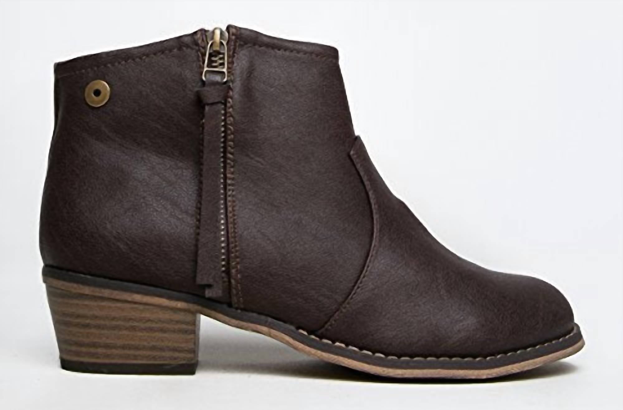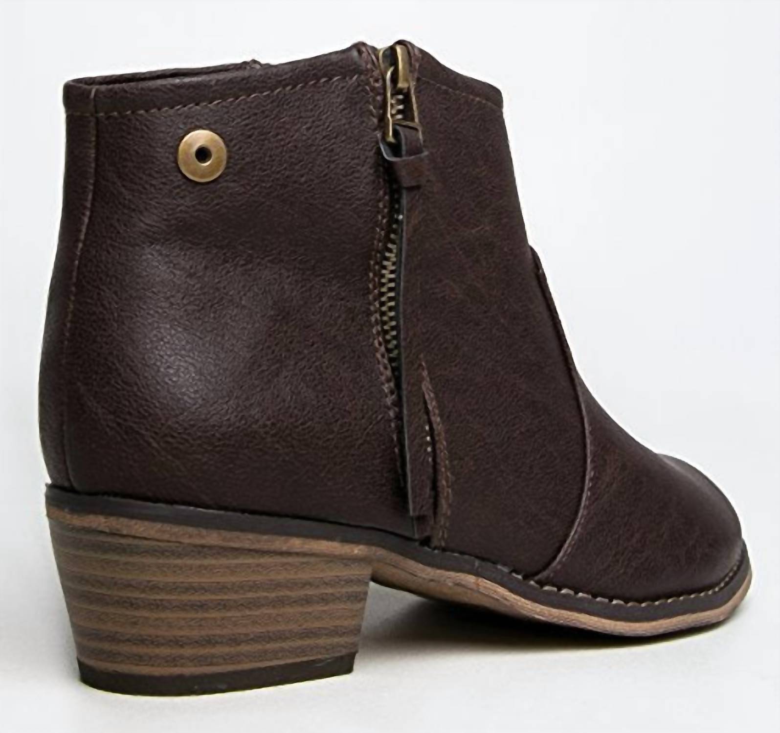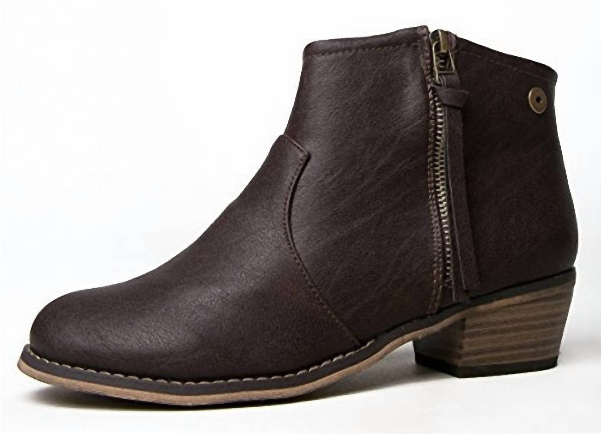 Say hello to the perfect, most versatile boot. The ankle height makes this style easily transition from day to night. Wear them with your favorite skinny jeans and tee for a more laid back look, or pair them with your favorite mini dress and jacket for a night out on the town. Step into style with the Women's Dorado Leatherette Zip Ankle Riding Bootie by Breckelles. This chic brown bootie features a trendy stacked block heel design with a comfortable 1-inch heel height and a rounded toe style. Made with a vegan upper, these boots offer a cruelty-free choice without compromising on style. Closure: Zipper closure. Perfect for summer occasions like a Thanksgiving dinner party or a casual western-inspired look.