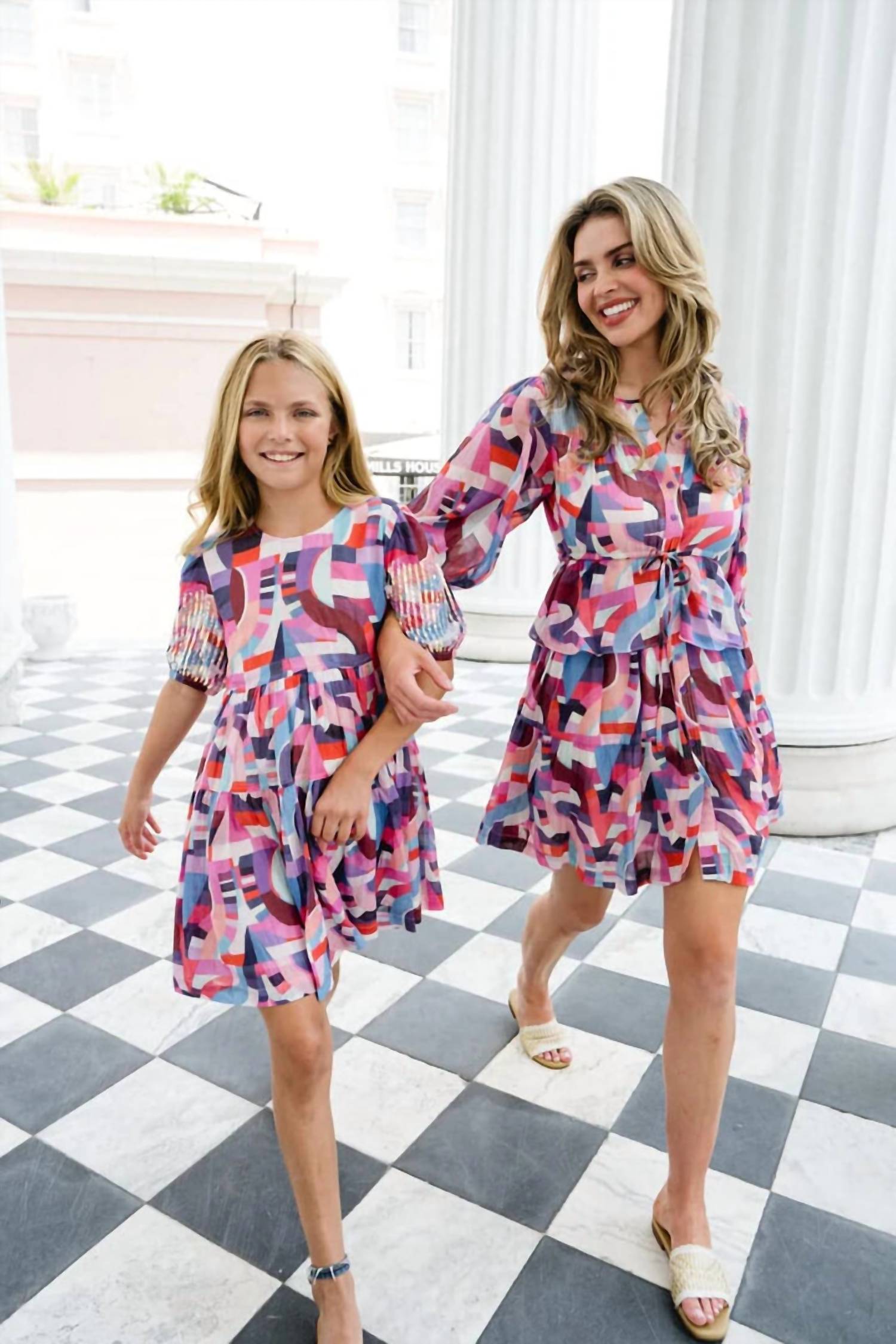The kind of easy and flattering dress you'll be reaching for all season long. Step into a world of vibrant fashion with the BRITON COURT Women's Evie Dress, a captivating mini piece in a colorful geo print. This dress showcases short sleeves and a flattering A-line silhouette, complemented by a tie waist and clear sequins at the shoulder that add a touch of sparkle. Crafted from a luxurious Cotton Modal blend, it features a V-neckline and button closure for effortless elegance. Care for this stunning piece is simple: machine wash, then line dry. Model is wearing a size XS (5'9" height, 34" bust, 24" waist).