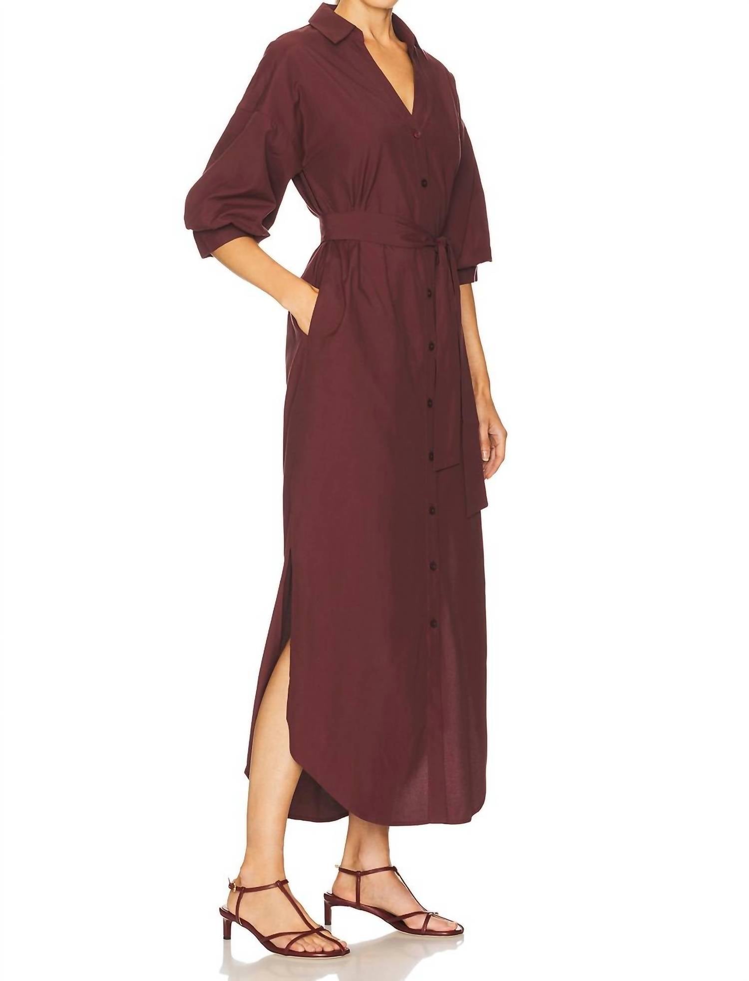 Introducing the Kate Maxi Dress by Brochu Walker, a sophisticated choice in a rich Barolo hue perfect for a Thanksgiving holiday party. This sheath silhouette dress features elbow sleeves and a crisp poplin fabric, complemented by side pockets and buttoned cuffs. The composition includes 65% polyester and 35% cotton, enhanced by a detachable waist tie closure and a front button closure for a sleek fit. Care instructions recommend dry cleaning to maintain its minimalist elegance.