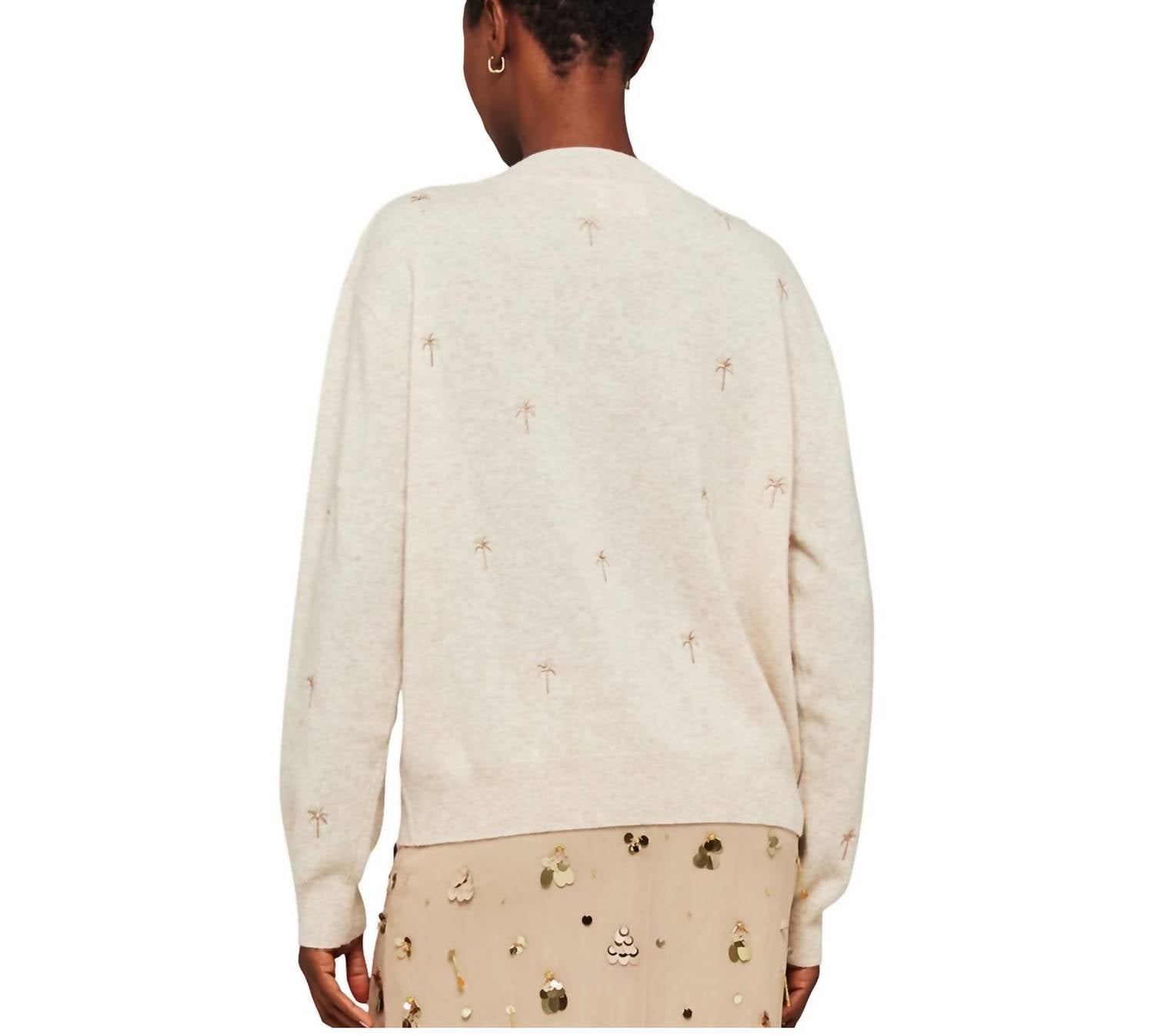 This cardigan will be a sweater-rotation favorite. Introducing the Embroidery Palm V-Neck Sweater by Brodie Cashmere, a tribute to Los Angeles' charm. This women's long sleeve sweater features a relaxed fit with a stylish V-neckline and intricate palm tree embroidery. Made from 100% premium cashmere, it boasts a soft texture in an elegant oat color with gold accents. Closure: Pull-on. This solid pattern cardigan is a perfect addition to any wardrobe.