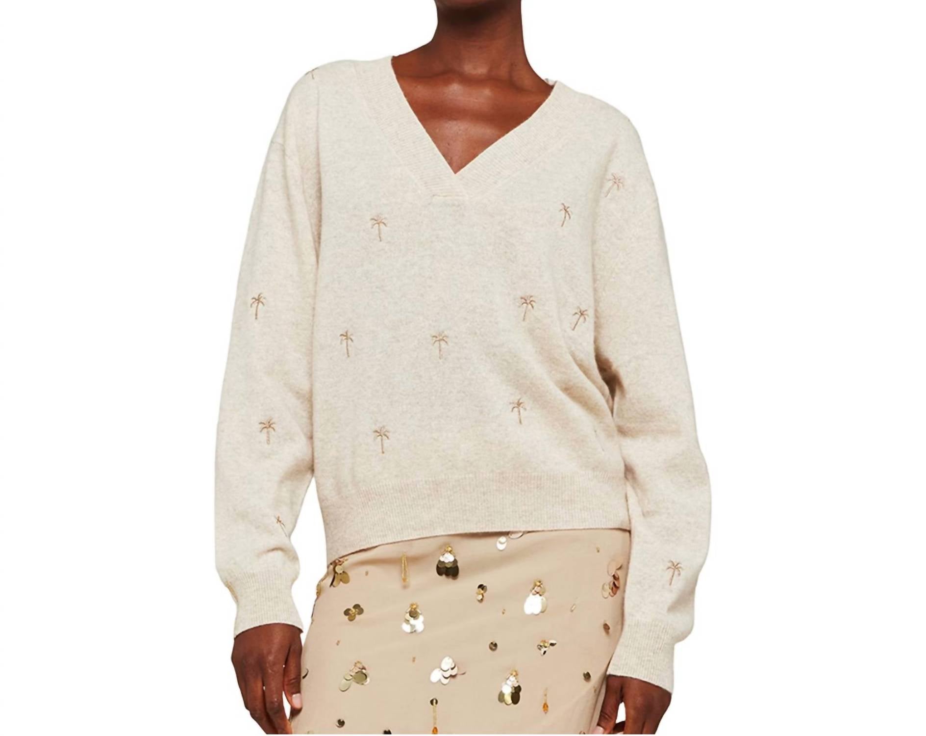 Introducing the Embroidery Palm V-Neck Sweater by Brodie Cashmere, a tribute to Los Angeles' charm. This women's long sleeve sweater features a relaxed fit with a stylish V-neckline and intricate palm tree embroidery. Made from 100% premium cashmere, it boasts a soft texture in an elegant oat color with gold accents. Closure: Pull-on. This solid pattern cardigan is a perfect addition to any wardrobe.