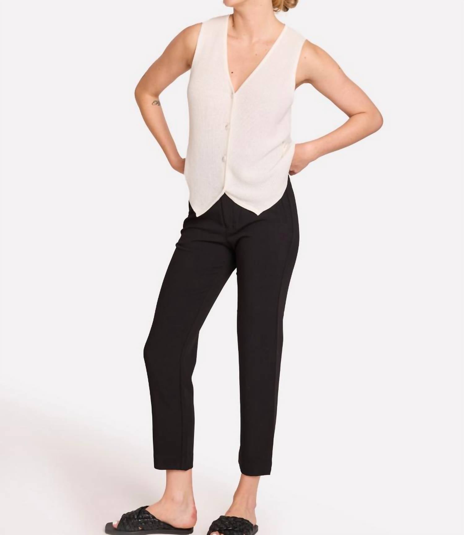 The perfect tank top for those warmer weather seasons. Elevate your ensemble with the Brodie Cashmere Knitted Waistcoat, a chic black sleeveless piece featuring a V-neck. This textured waistcoat is crafted from 100% cotton using non-toxic dyeing methods, offering both style and sustainability. Designed to fit snugly and rest at the top of the hip, it features a button closure for a refined touch. Machine wash and lay flat to dry.