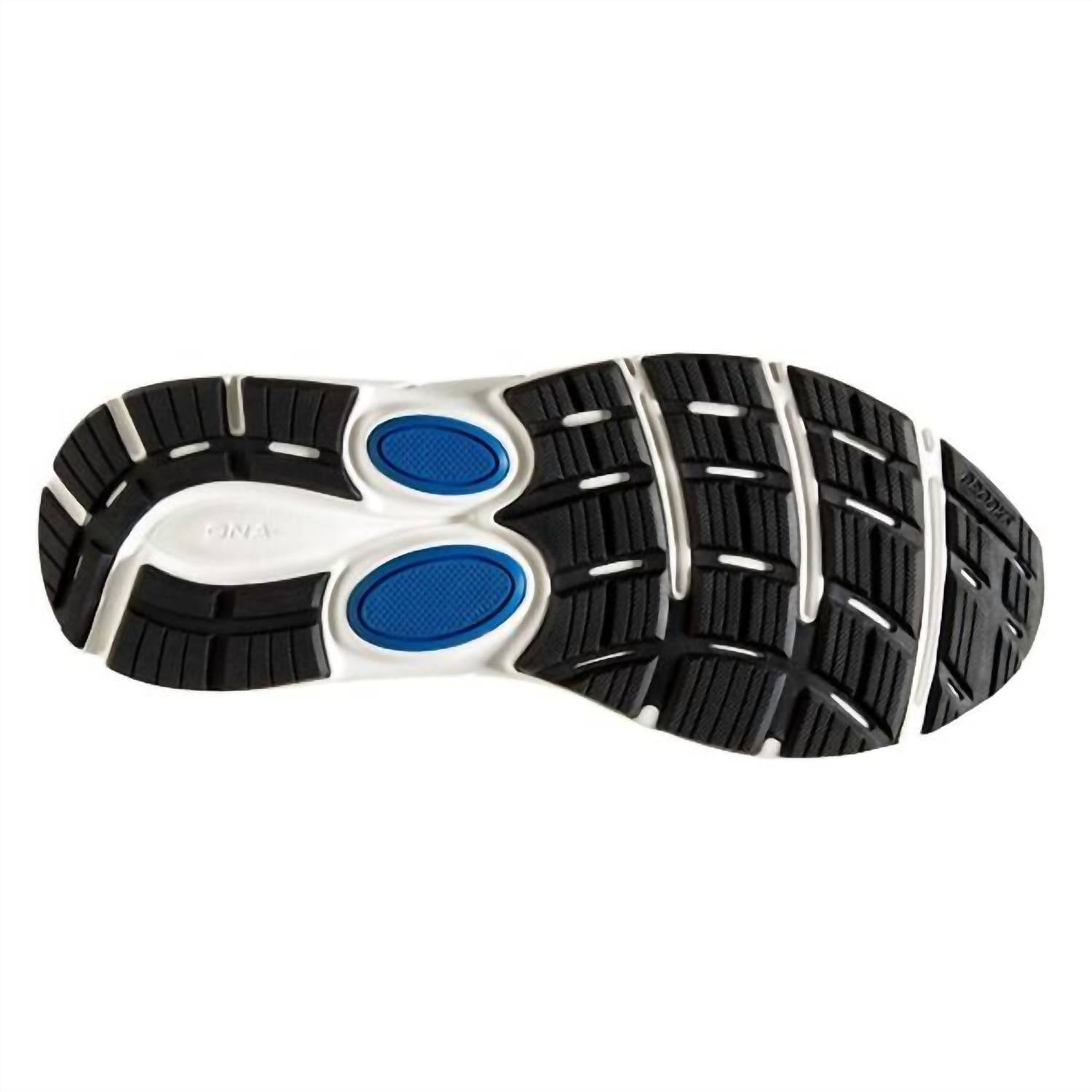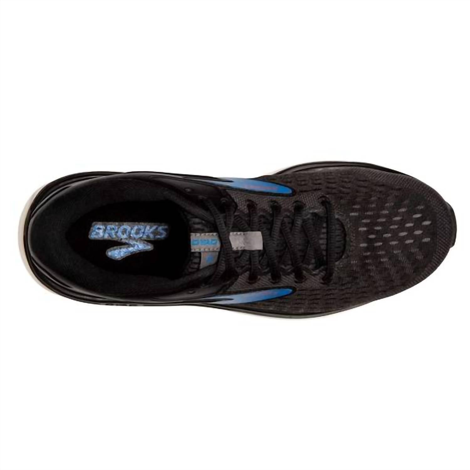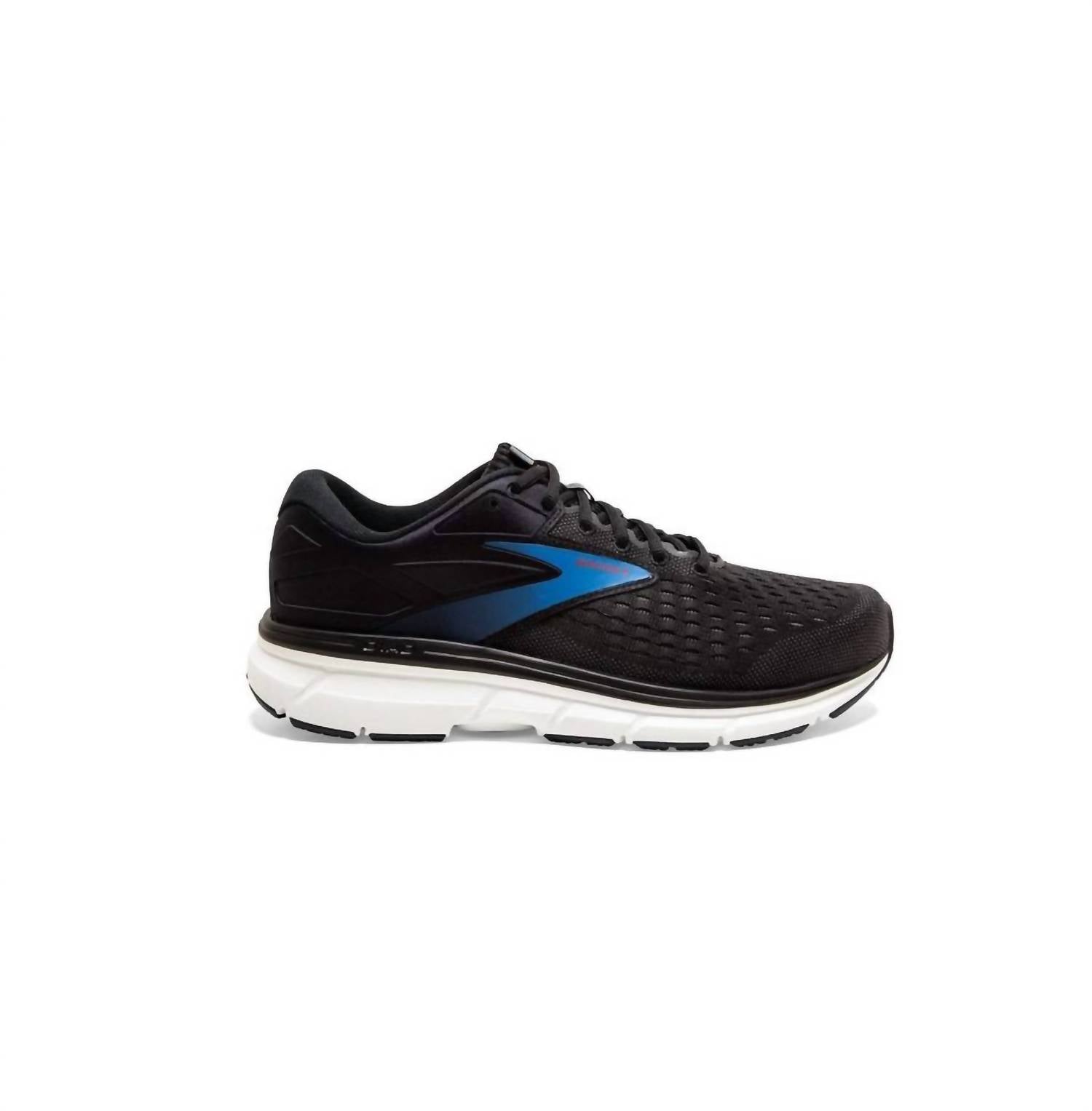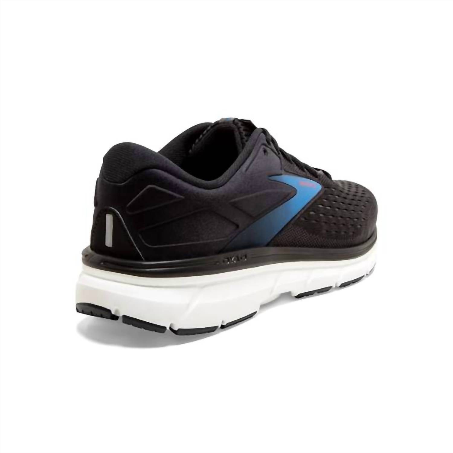 Meet the Men's Dyad 11 Running Shoes by BROOKS, engineered for an exceptional running experience. Featuring BioMoGo DNA cushioning, these shoes adapt to your stride, weight, and speed for optimal impact protection, while Dual Arch Pods ensure an inherently stable ride. With a generous fit, perfect for those requiring extra room or orthotic-friendly shoes, they weigh 11.6oz/329g and boast a 10mm midsole drop. Experience cushioning in a sleek black, ebony, and blue color scheme, ideal for fitness and workout sessions.