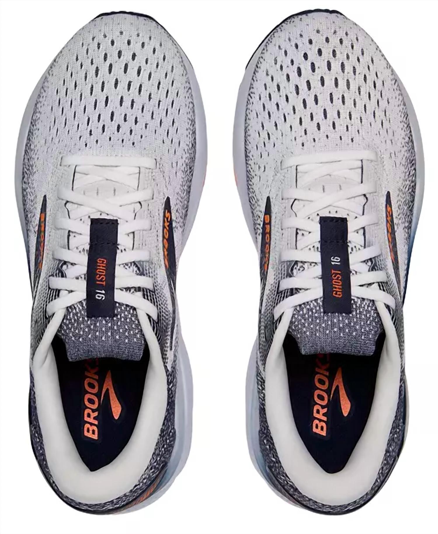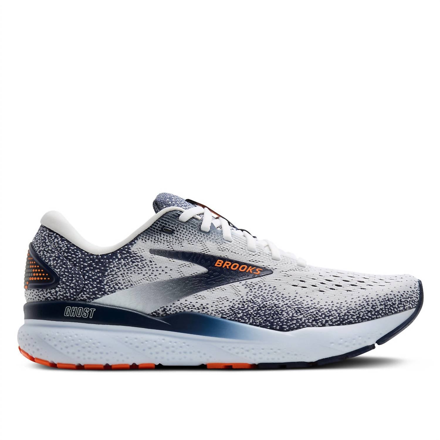 Introducing the Men's Ghost 16 Road Running Shoes by BROOKS, a perfect fusion of comfort and sustainability crafted for optimal performance. Designed with a lightweight, soft cushioning and an enhanced, breathable upper, these shoes are made with 67.3% recycled materials and divert 4.30 plastic bottles from landfills. Best suited for road running and walking, they feature a round toe and a low platform heel in a stylish White/Peacoat/Orange colorway. Embrace the athleisure trend and elevate your fitness routine with this certified CarbonNeutral® product.