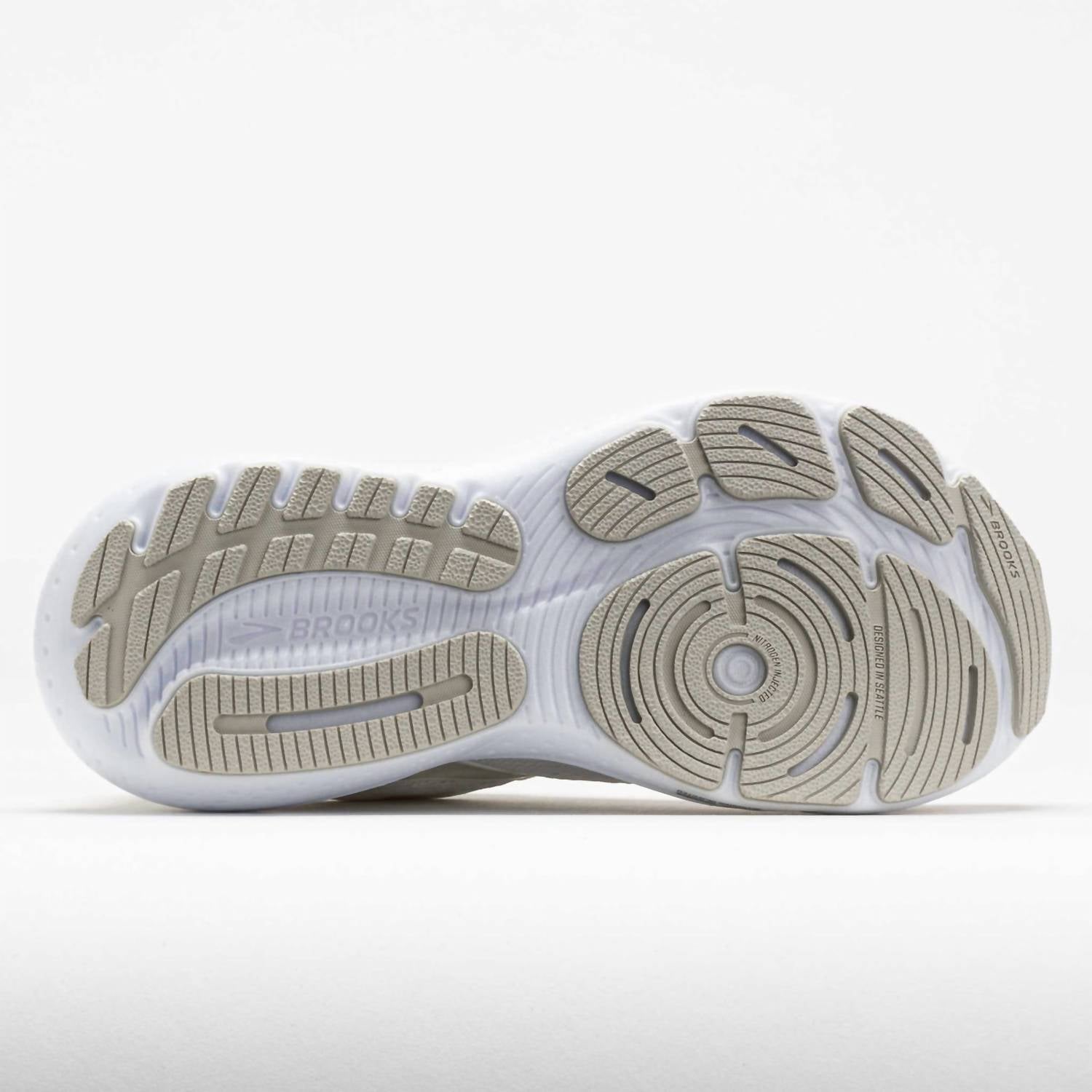 Introducing the Men's Glycerin 21 Shoes by BROOKS, a top choice for athletic performance and comfort. These shoes come in a sleek White/White/Grey color and are crafted with durable rubber material, ideal for a variety of terrains. Featuring a round toe and flat heel design, these shoes provide maximum support and stability. Perfect for adult men seeking reliable athletic footwear.