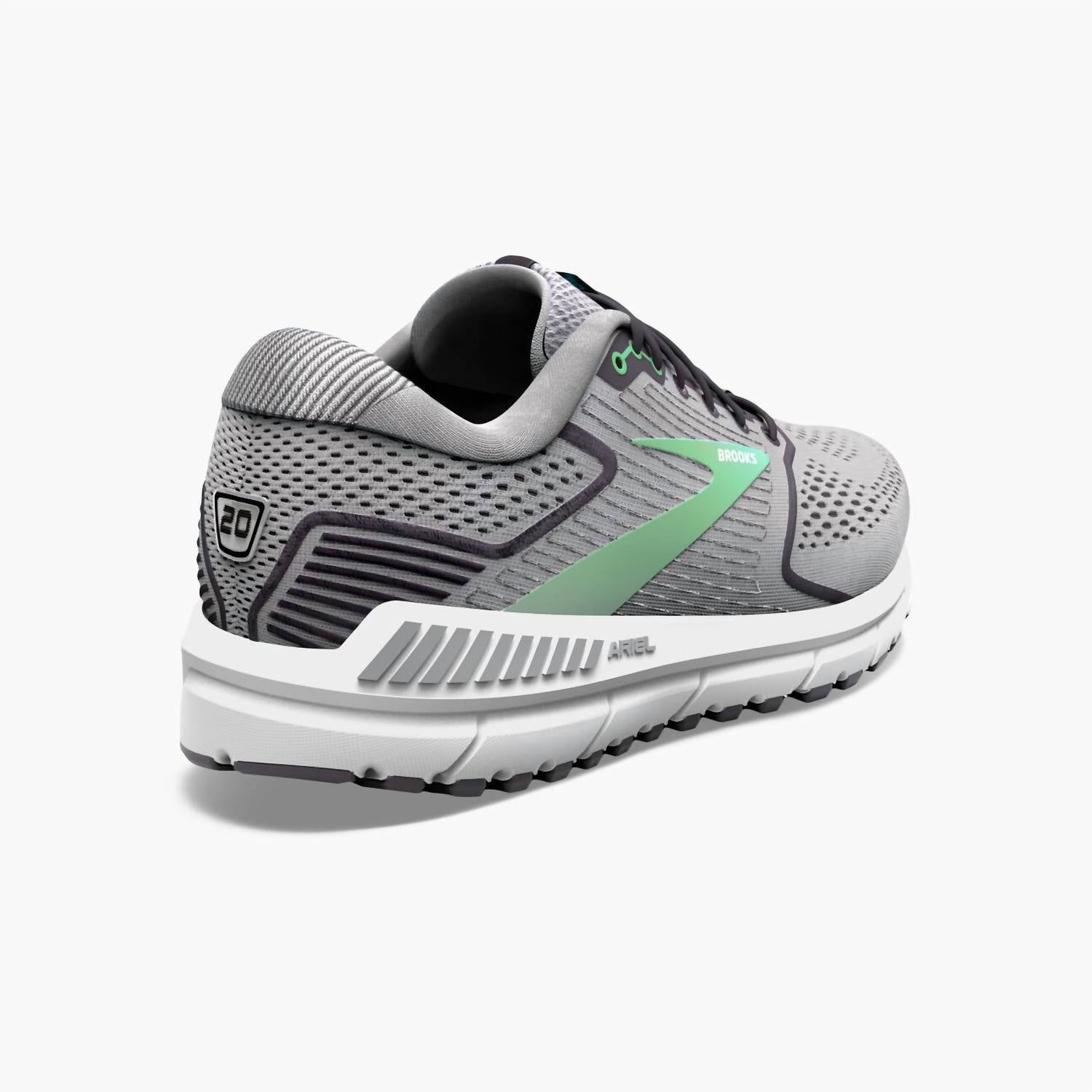 When fashion meets function. The Brooks Ariel '20 is a women's road running shoe designed for added support and a soft, cushioned ride, suitable for running and walking. It features smart support and enhanced fit. This model has a 12mm midsole drop and weighs 10.7oz (303.3g). It is also orthotic friendly.