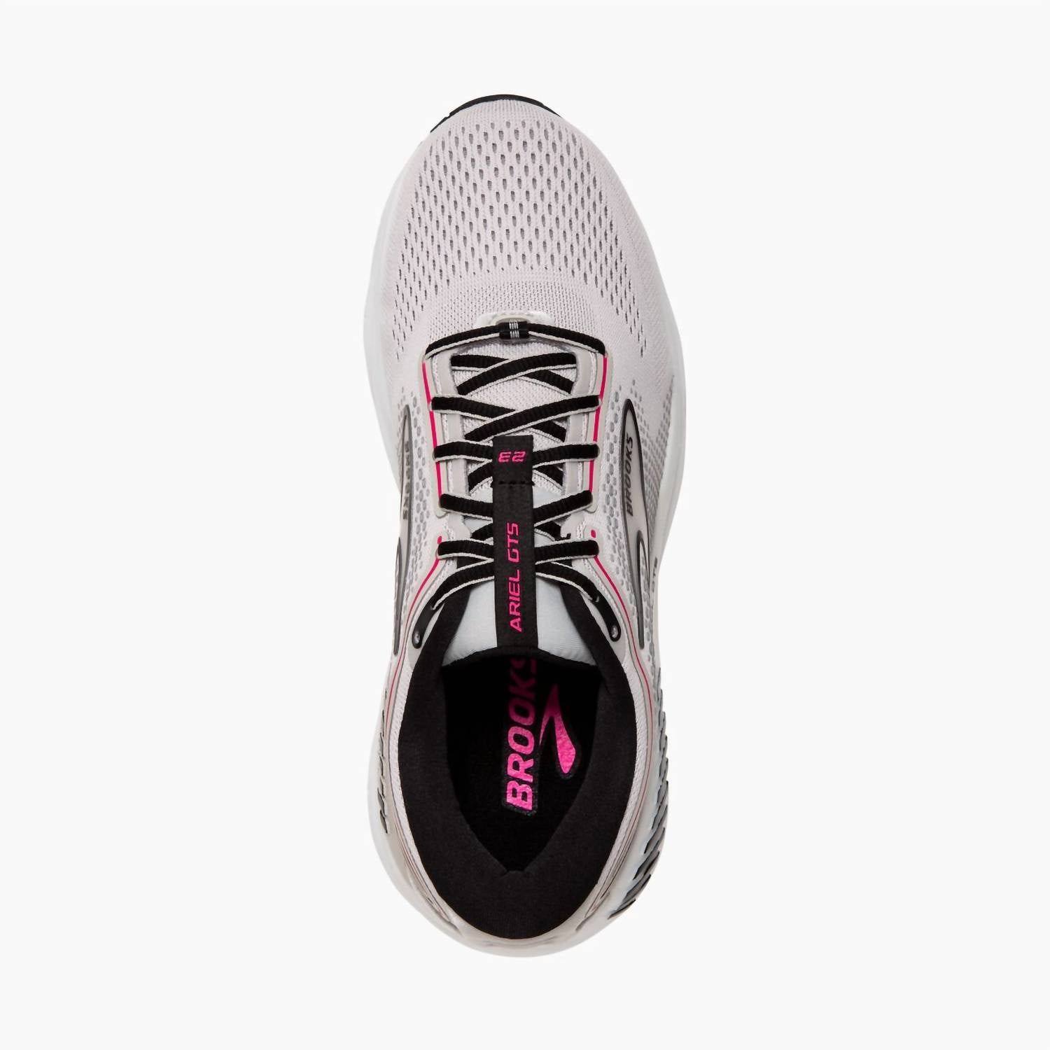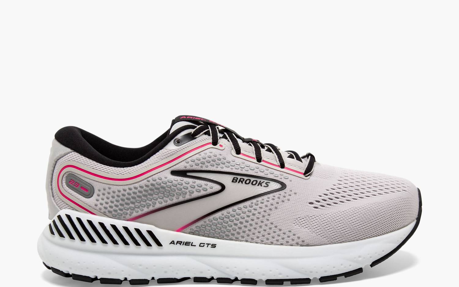 Stylish, comfortable and supportive. These athletic sneakers check all of the boxes. The Brooks Ariel GTS 23 women's running shoe provides stability and comfort with a wide base, soft cushioning, and a generous fit suitable for orthotics. Designed for road running, it features whole-body support, a 12mm midsole drop, and weighs 10.7 oz (303.3g). The upper contains 58.3% recycled materials.